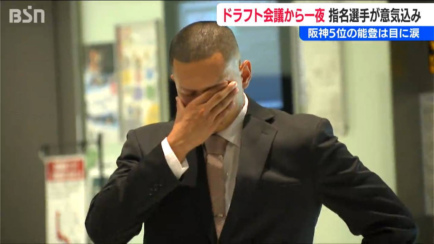 指名直後、能登投手は会場で感謝を伝えた後に男泣き。