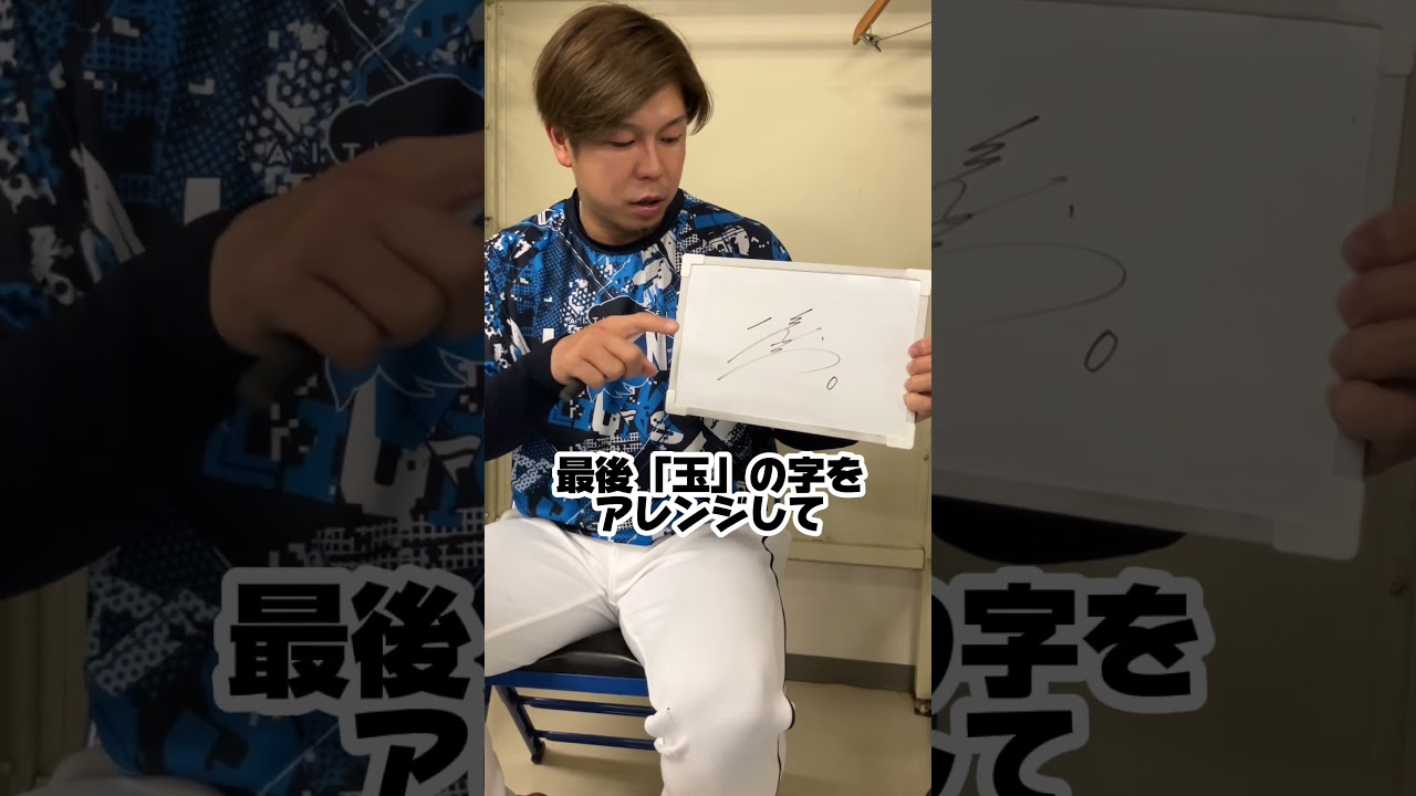 ま、してからずっとこのサインで こだまり涼介選手のサイン詳しく教えて [音楽] こだっていう自分の苗字をサにしました。まを崩してで真ん中ぐらいまでガプこで下がになってて最後玉をちょっと荒れてしてで天室つけてこういうサインにしました。 [音楽] ま、断してからずっとこのサインで大臣の先輩とか、 ま、お姉ちゃんがいんなしてもらった中で、ま、これいいなと思ったので、この際に決めました。 Ja.