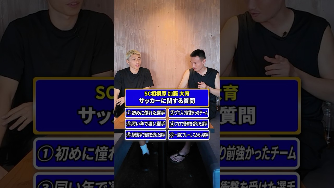 え、加藤大輔選手に 6つの質問。 はい。 サッカー編。 はい。1 番初めに憧れた選手 でこ プロになるまでに対戦して 1番強いと思ったチーム。 宅職大学 はい。 誰が? えっと、今で言うと宮崎の奥村浩。うん。 同じ年ですごいと思った選手。 根本。 プロに入って同じチームで、え、衝撃を受けた選手 無藤ゆきで対戦相手で衝撃を受けた選手。 今張りのビニシウス。 うん。で、これから一緒にプレイしてみたい選手。 早かった時。