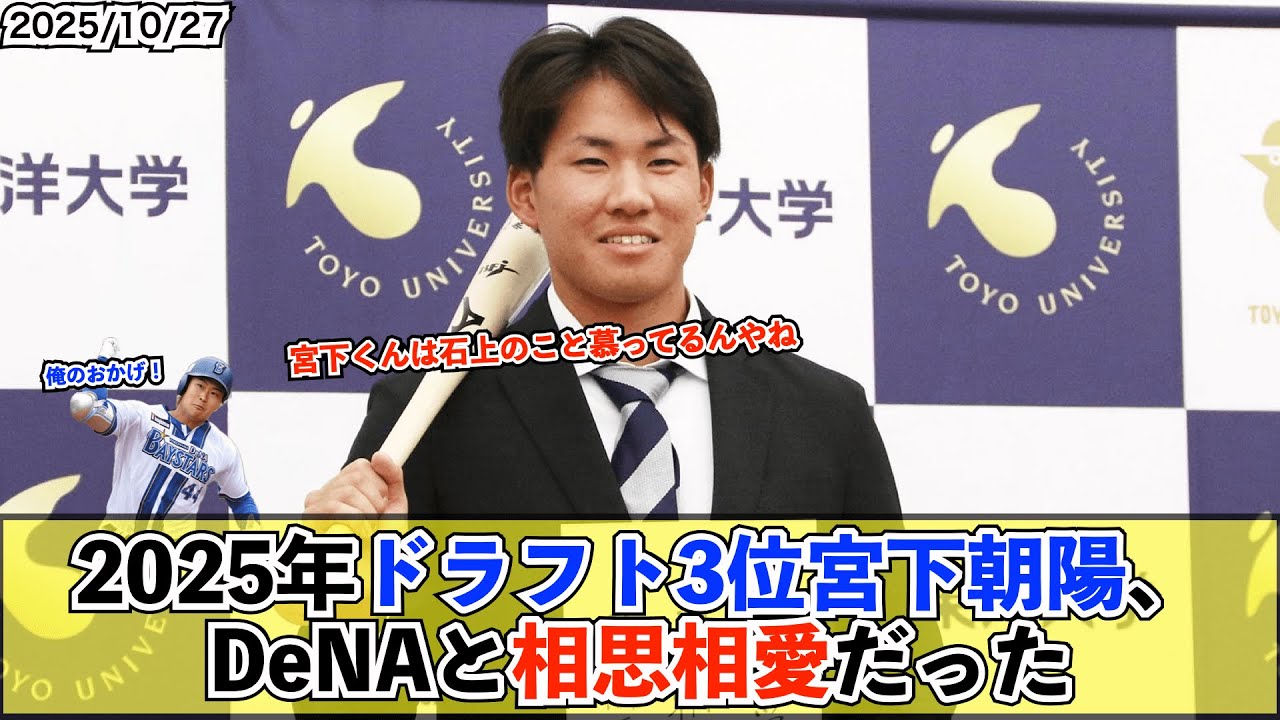 [音楽] 2025年ドラフト3位下朝日 DNAと総子相愛だった。 [音楽] [拍手] DNA ドラさドラフト会議翌日にぶっちゃける。実は面談では言ってなかったんですけどターズに行きたかったんです。下日選手について宮下選手も非常に高成青年で会高校時代から見てきた選手です。 火級生の時からレギュラーで試合に出てい ましたが、怪我で苦しんだ時期もあり、 それがなければドラ1レベルの選手だった と思いますし、この秋にはいい状態である ことを知ることができ、指名できて良かっ たと思っています。右打ちの内野種は貴重 な存在で、打撃にはステール感があります し、守備も卓越していて非常にバランスが いいのが特徴です。これも余談ですけど、 先ほど島田選手と話していた時、宮下選手 が実は面談では言ってなかったんですけど 、ベイスターズに行きたかったんですと 教えてくれて、我々としても非常に 嬉しかったですね。 宮下君もベイスターズったんか、神奈川に あるわけでもないのに。ハ子相愛ドラフト はやっぱ嬉しいわ。島田に洗脳されたん やろな。 のインタビューで浜下に行くことが多いとも言ってた。 藤ゆのライバルが増えてしまったんだ。 やは取ってくるからセーフ。 島田君は分かるけど下君はなぜ横浜ファンに? 宮下君は石上のことしってるんやね。タオルも持ってたしな。 まあ石ってめっちゃいい先輩感ある。 石が好きだから浜スに見に行ったり入るなら横浜が良かったりってことかな。 東洋からこんなに入るとは思ってなかっただろうな。 石かきっかけで浜せたくるようになったんかな。指名で喜んでくれて嬉しいわ。 ご視聴ありがとうございました。チャンネル登録、高評価、コメントとよろしくお願いします。 [音楽]