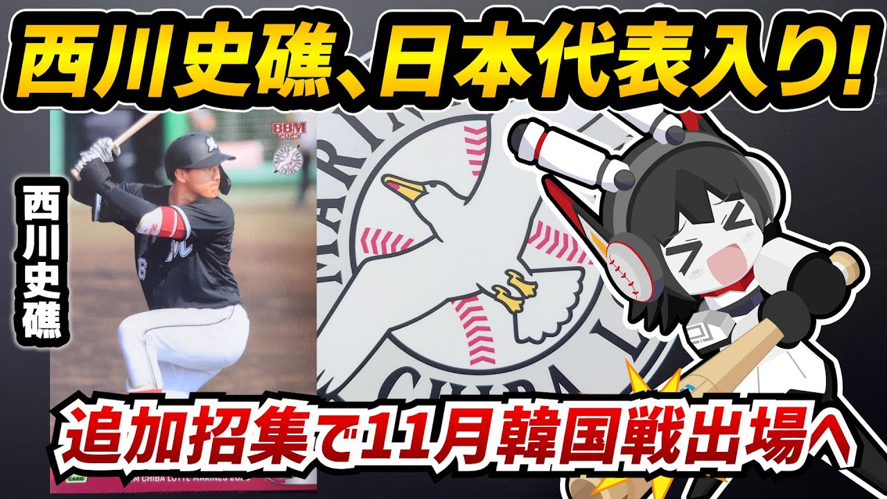 皆さん、こんにちは。千葉ロッテマリンズ 大好きバーチャルYouTuberの2割 8部です。 さあ、というわけで今日もロットることを 語っていく。いよ。 というわけで今日語っていきますのは 、え、西川未賞、え、侍メンバーに追加集 決定 です。さあ、一体全体どういうことかと 言いますと、え、本日ですね、10月27 日の月曜日のもう早朝にね、ビッグな ニュースが入ってきたじゃありませんか。 というわけで、え、来月ですね、行われる 、え、サムイジャパンのね、え、韓国戦 ですねの試合に、え、我らが 千葉ロッテマンズの西川美選手が追加で 選ばれたということでございます。お めでとうございます。おめでとうござい ます。いや、これ嬉しいですね。やっぱり ね、その、ま、やっぱあのね、俺実はね、 西川さんね、あのね、あの、ワンチャンね 、あの、先月ぐらいのね、メンバーハピの 時に選ばれるかなと思ってたんですけれど も、ま、残念ながらね、先月の段階ではね 、あの、メンバーでは選ばれなかったから 、ああ、ま、さすがに早かった、早かった か1年目は、あってルーキーからいきなり 代表っていうのは難しかったかなって思っ たんですけれども。いやあ、でもね、 しかしね、こうやってもうね、その追加 証集って形でね、侍メンバーに合流って いうのはね、めでえ、めでっていうことで ございます。あのね、元々ね、やっぱりね 、そのサムライメンバーっていうか、その 代表戦のね、メンバーが発表された段階で そのガ野が少ねえって言われてたんだよね 。ガイヤがなんかその2人か3人ぐらい しか3人か3人ぐらいしかいなくてって いうことでいやそもそもこれ大丈夫なのか いくらその代表戦っていうかね、その走行 試合というかね、そのエキシビション マッチというかその2試合3試合とはいえ そのねガイ野が少なすぎるんじゃない かっていうことでその誰かがねもしかし たら追加で選ばれるんじゃないかっていう 風に言われてたんですけれどもいやそんな 中でね我ら西川さんがね選ばれたのは めちゃくちゃめでたいですね。その元々ね 、そのあれキャンプっていうか、その岩田 監督がね、ゾぞリンスタジアムに来た時に そのすごいやっぱ西川選手を買ってたん ですよね。買ってたっていうか、その やっぱりその将来的な、ま、将来的にって いうかね、もう次回のWBCであったりと か、それこそオリンピックであった りっていうところでやっぱりその レギュラーを貼れる選手だということで、 ま、西川選手を非常に評価してたんです けれども、ま、そんな中でね、やっぱりね 、そのそういういわゆるその岩田監督の その高い評価っていうのがね、早速、ま、 発揮されるというかね、そういうところで ね、そのね、アピールする舞台がね、 いきなり現れたっていうのはこれはす 嬉しいですよね。ま、西川選手と言えばね 、やっぱりね、今期やっぱ新人王に いっぱい筆ト候補っていうところですし、 ま、なんと言ってもね、やっぱりね、この 後半戦にやっぱ打率上げまくったっていう のが非常にやっぱインパクトが強いって いうかね。ま、5月ぐらいまで打率が1割 だったのが、やっぱ6月ぐらいから メキメキと打率を上げていってっていう ところで、ま、最終的にはね、2割8部1 輪で規定打席到達ってところがやっぱり 印象っていうかね、やっぱりね、こんだけ やっぱり適用、適用力であったり、ま、 あとはね、そのやっぱり課題解決力って いうのが非常にね、できる。ま、言って しまえば野球、IQが高いバッターって いうのが非常に認識されてますから。いや 、だからそういうところもね、やっぱ監督 的には、ま、買というかね、監督的にもね 、やっぱね、いや、これはすごいぞって いうとこでね、やっぱ認識してくれたのか なと思いますね。だから逆にさ、だからさ 、その、あの、シーズン序盤でそのやっぱ 不調だったからこそ、ま、なんかその逆に ね、そのやっぱりそのめちゃめちゃね、 低かったからそっから上がってきたって いうのが1回その壁にぶつかったっていう ところがそのかなりアピールポイントに つって繋がってるっていうのもあるよね、 絶対にね。うん。 そのやっぱあとはね、やっぱ守備がいいっ ていうのもね、かなりでかいんじゃないの かなっていうのところもあるよね。西川 選手はね、あの今期レフトでめちゃめちゃ 守備も良かったし、ま、肩も強いし、打球 判断力であったりとか、ま、やっぱり本当 にね、その1級1級に対する集中力って いうのが非常に高い場面っていうのは、ま 、もちろんね、やっぱロッテファンもね、 存じ上げておりますので、そういうところ でやっぱりね、その代表戦っていうやっぱ 日の丸を背負った大きい舞台でもね、そう いう力を発揮してくれれば、ま、本当にね 、やっぱ今でこそやっぱパリー、パリーグ ファン、ロッテファンっていうところでは 注目されてるけど、やっぱりね、まだね、 その全国区ではアピールっ