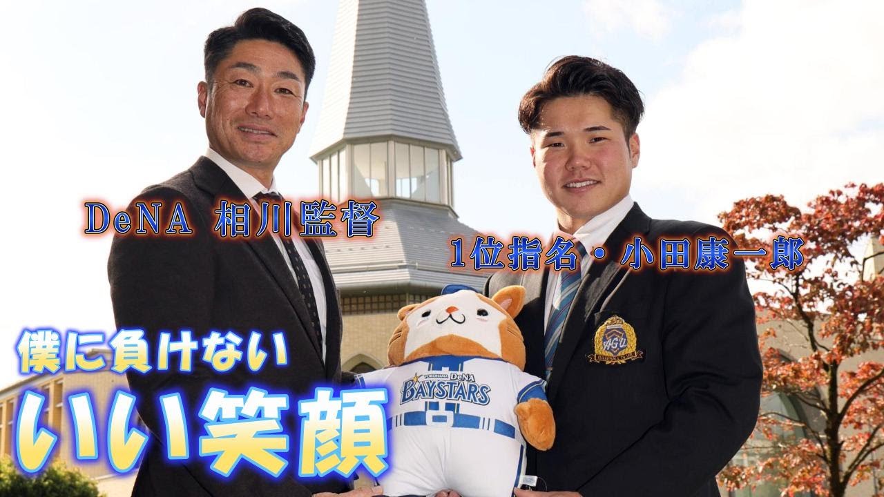 DeNAからドラフト1位指名を受けた青学大の小田康一郎内野手が27日、神奈川・相模原市の同校で相川亮二監督らからあいさつを受けた。相川監督の訪問は事前に知らされておらず、小田は「ちょっとびっくりした」。相川監督は「僕に負けない、いい笑顔を持っている」とサプライズ対面を喜んだ。