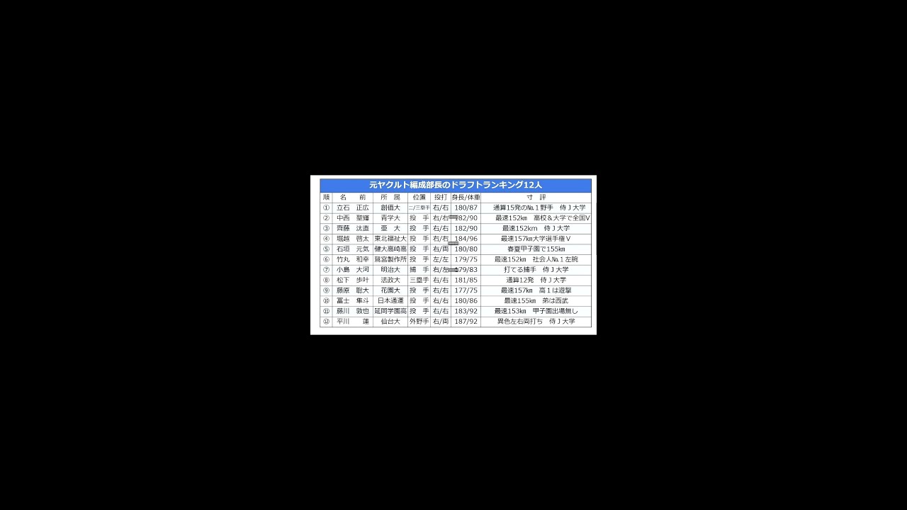 ドラフト会議正に注文松祭優店が選ぶ。 黒野球ドラフト会議が明日23日に迫る。 総加代の縦石正に人気が集まっている。健田高崎の石垣元気も注目選手の 1人だ。 広島は縦正の一使名を故している。 西武は小島大ガを一指名すると発表した。 今回のドラフトは大学生に戦力が多い。投手とや友に有望な選手が揃っている。元ヤクルト編成部長の祭り氏が選ぶ。 [音楽] 独自のドラフトランキングが作成された。すべき 12人のドラフト候補発表。 松井島の村の元でヘッドコーチ経験。 彼の視点からドラフト候補が選ばれた。 即戦力大学生が多数いるのが特徴のドラフト。 明日の会議でどの選手が指名されるか注目。 松石の選んだ人についてどう思いますか? あなたの注目聖書をコメントで教えて