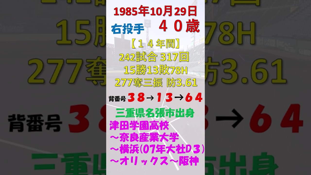 [音楽] 1985年10月29日生まれ。今日が 40歳の誕生日の野元プロ野球選手は誰 でしょう?現役14年間で242試合13 試合に先発15勝13杯78ホールドの右 投手。三重県津田学園高校奈良田良産業 大学から2007年大学社会人ドラフト3 巡目で横浜に入団10年オフ2対1の トレードでオリックスに移籍14年オフ 白田博選手とのトレードで阪神に移籍17 年67何試合に登板し最優秀中継投手の タイトルを獲得年800万円から 4500万円となり消率463% は球団日本人歴代最高とされています。 68年も62試合に登板は21年引退。 スポーツ用品店に勤務後24年から タイガースアカデミーのコーチに就任して います。 [音楽] 桑原健太郎選手でした。