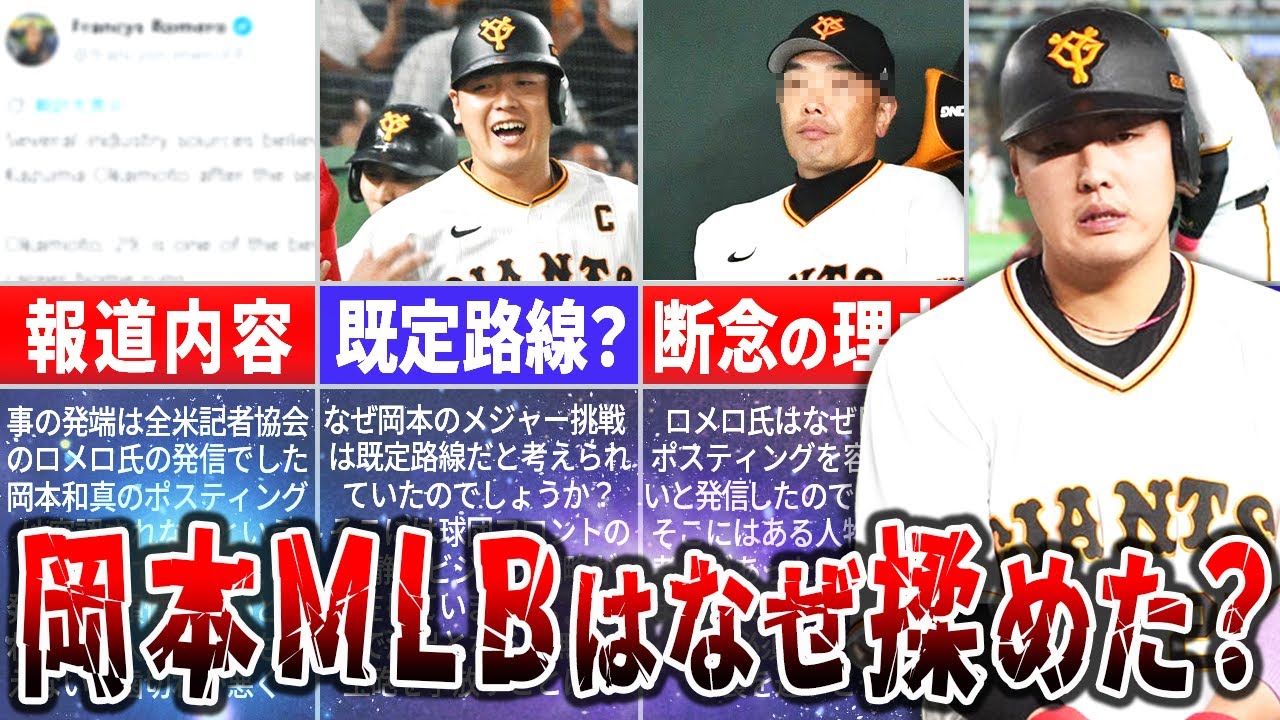 読売りジャイアンツの手法岡本和 2025年オフ彼のポスティングによる メジャーリーグ挑戦はファンもメディアも もはや規定路線と確信していました。 しかしシーズンが終わりその時を待つ ばかりだったタイミングで全てが拍紙に なるという衝撃的な報道が飛び込んでき ました。さらにその報道の後巨人は会見を 開き本のポスティングを容認することを 発表。なぜここまで来て情報が2.3点し たのでしょうか?今回は岡本和がメジャー 挑戦が2.3点した。その知られざる真層 に迫ります。 [拍手] ことの発端は全米野球記者協会に所属する フランシスロメロ記者が自身のSNSに 投稿した1つのポストでした。複数の関係 者によると読み売りジャイアンツは シーズン終了後、サード県ファーストの 岡本をポスティングしないと考えている。 29歳の岡本は通算248ホームランを 記録する日本野球会を代表する強打者の 1人。たったこれだけの短い文章。しかし その衝撃は日米の野球会をまた琢磨に か駆け巡りました。なぜなら岡本和の メジャー挑戦はもはや時間の問題と考え られていたからです。アメリカのメディア では彼の名前はヤクルト村上孝と並び、 このオフの目玉選手として連日のように 報じられていました。ヤンキース、レッド ソックス、フィリーズ、そしてマリナーズ 。具体的な球団名まで上がり、獲得競争は 必死と見られていたのです。そんな中で 訪れた突然のポスティング見送り報道。 ロメロ記者の情報はその信頼性の高さから 単なる噂では片付けられません。アメリカ のメディアも 日本の一流打者がFA史場から外れること になった岡本を獲得するチャンスを伺って いたメジャーリーグチームにとって悪い 知らせだと驚きを持ってこのニュースを 伝えました。もちろんこれはまだ正式な 発表ではない状態でのポストでした。 しかし、過中の岡本和本人もまたそのはれ の悪いコメントでこの報道の心憑性を皮肉 にも高めてしまうことになります。球団の 許可が必要なもので僕が同行できる話じゃ ないので何とも言えないです。行きたいと も行かないとも岡本の口からは聞こえてき ません。ただ自分の意思だけではどうにも ならないという無力感をにせたこの言葉は 彼の夢の前に大きな壁が立ちかっている ことを暗示しているようでした。このオフ 日本人選手のメジャー挑戦は1台トレンド となっています。ヤクルトの村上孝を筆頭 に西武からは高橋コーナと今達也のダブル エースが挑戦を表明い阪神の若きエース木 ヒや楽天の本高弘と辰涼介も海を渡る可能 性が報じられています。これだけの選手 たちが次々と夢への挑戦を決意する中で なぜ岡本和はその扉を閉ざされると報道さ れたのでしょうか?ホームランを3回、 打点を2回に加え、ベスト9を2度、 ゴールデングラブ賞を3度受賞した日本を 代表するスラッカーであり、WBCでも 打率3割3部3輪、2ランと活躍して、 その評価は世界的なものになっていました 。年齢も29歳とまさにキャリアの絶調期 。これ以上ないタイミング。いや、絶対に 逃すことができないというタイミングでの 挑戦。それにも関わらずなぜ彼の夢は突如 として打ち砕かれようとしていたの でしょうか。その裏には私たちファンには 図り知れない複雑な大人の事情がうまいて いたのです。 なぜ岡本和のメジャー挑戦は土タ場で暗証 に乗り上げたと思われたのでしょうか? その複雑に絡み合った意図を解きほぐして いくと1人の男のチームの未来と自らの 身体をかけた強固な意思が浮かび上がって きました。その男の名は安倍慎之助。 読み売りジャイアンツの第20代監督です 。彼が球団の手法であり、守備でも高い 貢献をする岡本の流出になぜこれほどまで に強く、そして片くに反対したのか。その 理由は表向きには至ってシンプルです。 2026年シーズン絶対に何があっても 優勝するため2025年のジャイアンツが いかに岡本和という1人の選手に依存して いたか。その事実はシーズンを詳細に 振り返れば火を見るより明らかです。4月 終了時点では晩弱の戦いぶりで首を回送し ながら5月諸順に岡本が守備での工作 プレイにより無年の先戦離脱をすると チームはまるで魂を抜かれたかのように 急止失速しました。さらに勝負どころの夏 以降には先発投手人がそう崩れとなり、 最終的には屈辱の3位クライマックス シリーズでもいいところなくあっけなく 敗退しました。このあまりにも分かり やすい失速劇が物語るのは今の ジャイアンツに岡本和の光継者と呼べる 存在が誰1人として育っていないという あまりにも厳しくそして情けない現実です 。そんな脆弱なチーム状況で打線をほぼ1 本で支えている太い大国柱であり的支中で もある手法を失うことになれば来シーズン の優勝など夢のまた夢になってしまいます 。安倍監督がチームの尊望をかけて彼の 流出を断固として阻止しようとするのは 監督として4国当然の判断と言える でしょう。しかし彼の強高な反対の裏には もう1つ単