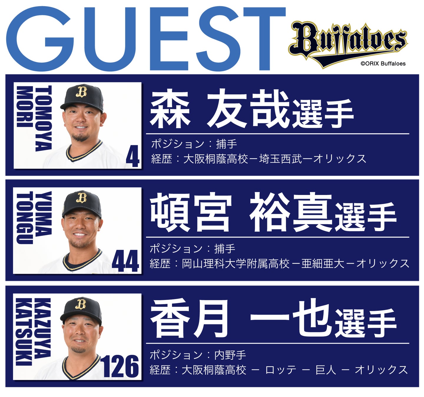 オリックス・バファローズの森友哉選手 頓宮裕真選手 香月一也選手の3名が登壇。来場者も参加できる双方向型の企画も予定しており、選手たちとの距離が縮まるイベントとなっております。