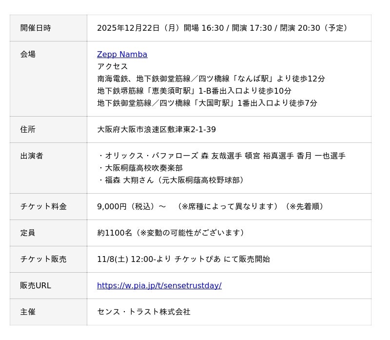 センス・トラスト株式会社(本社:大阪府大阪市、以下:センス・トラスト、代表取締役:今中康仁)は、2025年12月22日(月)に「SENSE TRUST DAY」をZepp Nambaにて開催いたします。
