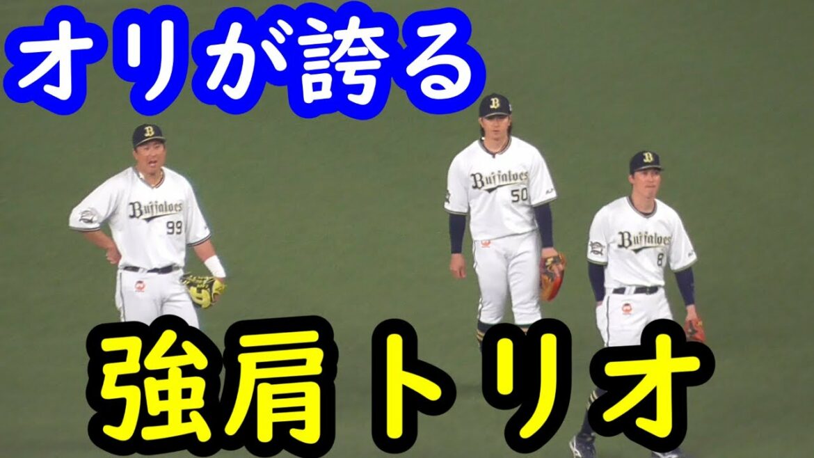 3月12日 試合前ノックでライトにオリックスが誇る強肩自慢が揃いました。バックホーム送球です