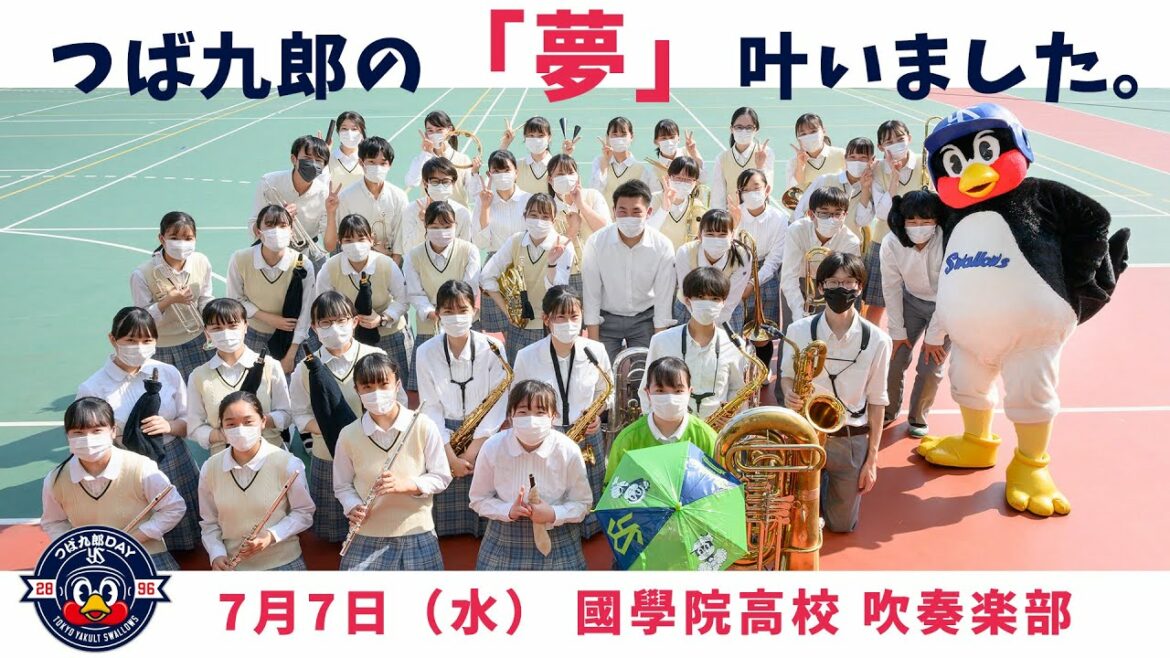 7月6日・7日 つば九郎DAY~七夕~のラッキーセブンに、つば九郎の「夢」が叶いました。以前は、鳥小屋に「青山高校」と「國學院高校」の生徒が演奏する音色が聞こえてきた。あの音色を聞くのが好きだったつば九郎が、両校にお願いをして・・・ついに・・・神宮球場で「東京音頭」が響きわたる!