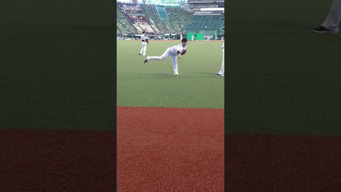 バッティング練習中に投手陣はセンター付近でアップやキャッチボールで体を動かしていますが、外野フェンスに向かって奥村投手がコーチとフォームチェックしながら練習をしていました。