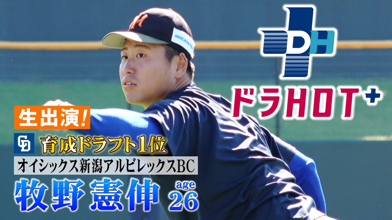 育成ドラフト1位指名をいただきました 牧野健身です。今日は新潟から来ました。 よろしくお願いします。ドラホットプラス スタートです。 今日のドラホットプラスは育成ドラフト1 位マキロ剣身が生出演。最速153km サワに迫る。 あらに今日から始まったコチでの周期キャンプ初日の模様を速報でたっぷりお届け。 こんにちは。ドラホットプラスです。さあ改めまして今日はですね、育成ドラフト 1 位の健身さんに来ていただきました。よろしくお願いします。 よろしくお願いいたします。 さあ、それではあの改めて自己紹介をお願いします。 はい。 はい。え、O6 型ビレクスベースボールクラブから 参りました。負けの剣身です。よろしくお願いします。 よろしくお願いいたします。 ま、指名から1 週間経ちましたが、今の気持ち実感はどうですか? はい。そうですね。もう日を重ねるごとにじわじわと 実感してきてますね。 今日もドラゴンズールの肉体をしてきてくださいということです。 ですよ。もうね、 テレビ出てますからね。 よろしくお願いしますよ。 よろしくお願いします。 さあ、え、岩さん、あの、同じ左の長杉で、そして名前が剣身ということで、なんか色んな意味で楽しみですよね、これから。 そうですね、要素を混ざってますから。 そうです。そうです。 活躍してほしいですね。 活躍ですよね。なんだって活躍ですよ。そう。もう今日どうですか?こうテレビに出て雰囲気的には。そうですね。なんか、ま、ちょっとドキドキはしてるんですけど はい。心強い方たちがいるので。 うん。 そうですよ。 お願いします。 本当に隣にいる人はすごい強いですからね。よろしくお願いいたします。 のお話伺わせてください。 え、まずはマキの剣身投ご紹介します。マキ お。 はいはいはい。 すごい。 ドラゴンズ育成ドラフト 1位。O6新潟のマ野剣身 26歳。 150km 超えたっすぐとチェンジアップのこの球の組み合わせが武器。 武器は自身でも語るように。 最速153kmのストレートと ブレーキの効いたチェンジアップ。急を武器に高い脱三振力を誇る本格化サウスポーだ。 まっすぐで、え、押せるだけの威力は持ってますし、 ま、チェンジアップだったり、スプリットだったり、スライダーだったりっていうのもうまく使える投手なので、バランス的に整った投手なんじゃないのかなと感じてます。 チーム所属から2 年目の今シーズン先発ピッチャーだった牧野はシーズン途中にリフへ転校。それが大きな天気となった。 急速が1番分かりやすく伸びて 146から153になっ 急速は一気に 7km もアップ。その急速アップがマ野の球を生かした投球に磨きをかけると。 はい。 その結果、リリーフ天候後はイニング数以上の脱三振を記録し、防御率は 2.52。 高成績を残し、被願のドラフト使命につがった。この後は牧の剣身のキャラクターを深堀り。さらに現在のチームメイトで元ラゴンズのあのピッチャーも登場。 育成ドラフト1 位の牧校時代は北海道白川高校のエースとして地大会準優勝に貢献。しかし藤大学に進学後は怪我もあり戦の登板機会は 1度もなかった。 もう大学の4年の時にはい。リーグ戦も 投げてないですし、就職かやっぱそこの 1番考える時期だってどうしようかなって なったんですけどそこでやめた時を想像し て仕事をしてるの想像するとなんか言い訳 してそうだなみたいなはい。 やりきれてない部分もあったんで 不完全年勝だった大学時代マ野は独立リーグで野球を続けることを決意。所属 2 年目には最多賞に輝くが結果は指名漏れ夢の舞隊には届かなかった。 タイトルも取ったんで、それで行けなかったんで環境変えるのも 1つの手だなっていう風に思って プロへの思いを捨てきれなかった牧野は新天地としてイースタンリーグに参入した 6新潟を選んだ。 そんなチームを引きるのは お母さん見てる? 愛知県名古屋出身。かつてファイターズで活躍したサウスポー武田正監督。 本人本当にこう苦労人でして高校大学立リーグ経て新潟に入って本当にこう遠回りはしたと思うんですけどその遠回りが実ってね嬉しかったです。 さにチームメイトもない。ま、今年 1年にすごい牧さんはかけてたので、ま、 1 年にかける思いっていうのが練習の取り込み姿勢から見えてて実際選ばれたのでそこがやっぱ尊してる部分です。 チームの先輩でかつてドラゴンズでプレイしていた笠原翔太郎もこう証言する。 春のキャンプ同じ回るよ。ずっと見て なんか見れましたけどもう朝からバンバン ずっとグラウンドでなんか 全然部屋にいなくて朝の早くから もう結構早段とかストレスなんか色々やる ことやったりとかしてなんか 今年にかけすごい強いんだなっていうのは 感じてます。今年しかないだろうなって いう風に 思ますね。 来年ってなるとまたさらにハードルが上がるんで今年な何とか引かないとなっていう風にはい。思って 覚悟を持って挑んだ今シーズン配置転換と不屈の精神で掴んだ涙のドラフト使