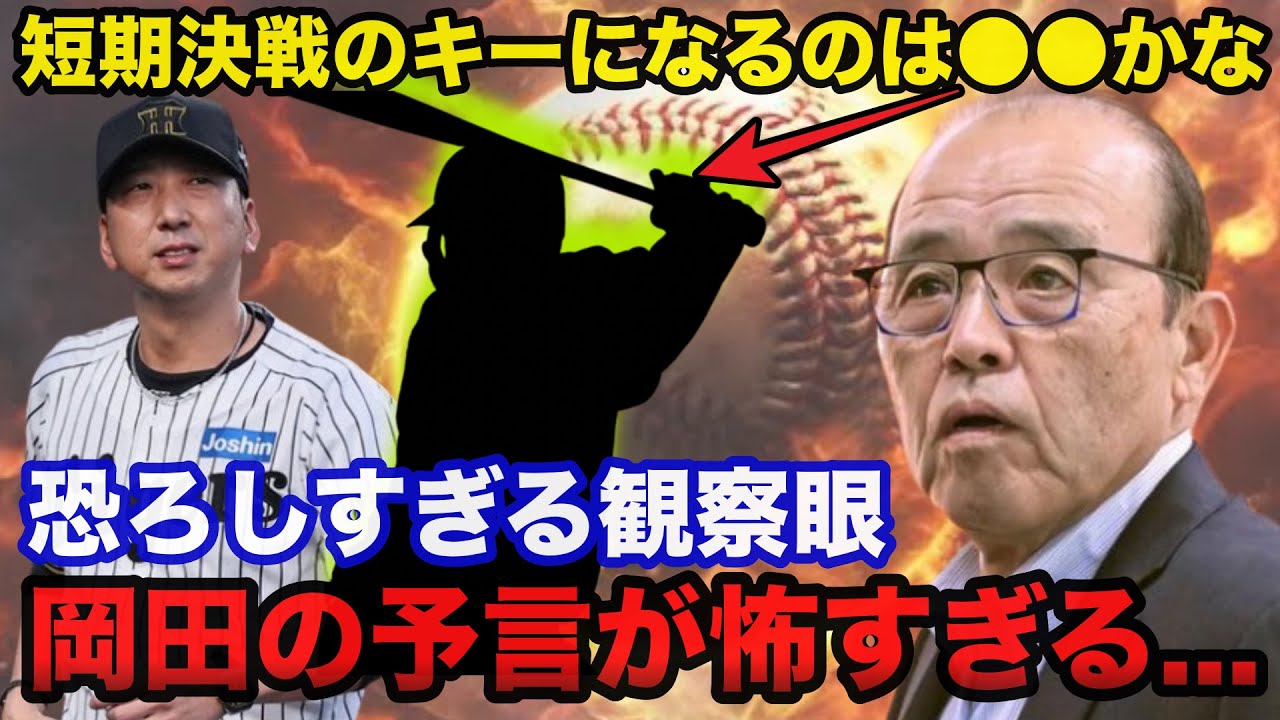 日本シリーズ開幕前に岡田が放ったある 予言2025年日本シリーズ専門家の予想 では阪神タイガース圧倒的有利という下場 表が多かったというのもソフトバンクは 新庄日本ハムとのペナントレースを終盤 まで戦い抜きクライマックスシリーズの ファイナルステージも日本ハムと戦い最終 戦の第6戦までも連れ込んだ選手の疲労度 も酷日本シリーズへの準備も万端とは言え なかった。対して阪神は史場最速でリーグ 優勝を決め、DNAとのクライマックス シリーズも無傷の3連勝と圧倒的な勢いで 勝ち上がってきた。しかし阪神タイガース は戦後2リーグ制以降の通算勝率はリーグ 2位であるにも関わらず日本シリーズを 制したのはわずか2回しかない。そこで その2回を1985年の1回目は主力選手 として2023年の2回目は監督として 挑みで知られる岡田信付け顧問は日本 シリーズの開幕前からどう見ていたかと 言うと開幕前シリーズ男 はと聞かれた岡田は これはねある程度5番まではマークされる からね5番まではシーズンで売っていた からやっぱり相手も研究してくる と近本佐藤明大山森下ら上位打線に並ぶ面々面々はあえてキーマンにあげなかった。その上で キーになるのは6番かな とぽつりと予言する。そしてその理由を シリーズ男ねやっぱり打点も絶対多くなると思う。 6番が機能すればね と注目ポイントに打順を上げた。 また別のテレビ番組では短期決戦で大事なことを聞かれた岡田市はまず 勢いやな先手必勝や と答え続けて 大事なのは初詮ですね。今度また福岡なんでね阪神は福岡で 7連敗中ですよね。 星野さんの時からね、あの時もサードコーチャーしてたけど と雇する2003 年の東保星保守の千一監督引きる阪神も強かったがこの年の日本シリーズは究極のうち弁形シリーズとも呼ばれ福岡で 1勝もできず結果 3勝4敗で日本1を惜しくも逃した。 そして岡田市は阪神が福岡で日本シリーズ 7連敗中と言い そういう意味で初詮村上で行くと思いますけど 1勝一ぱでいいですけどね と語ったまたビジター球場で始まることについては あまりいい思いはないですね と明かしたそれでもシリーズのキーマンを問われるとおしは あまり相手は関係なく自分らの野球をすると大丈夫と思うんですけど とした上で、 本当に先手必勝というか、勢いというか、初戦で早いイニングにドーン行かれるとやられて一番悩むのは坂本ですよ。そういう意味でも初戦で村上と坂本が抑えてしまえばその流れで行ける と保守の坂本聖子郎を指名していた。そして岡田市の思いは届き福岡で念願の一象を上げ一杯の上場の成績。 [音楽] [音楽] 阪神は熱狂的な虎島のいる聖地甲子園に 戻ってきたが、岡田市の予言は当たった。 2023年岡田市がオリックスと戦った 日本シリーズでは恐怖の8番打者として 知られた木也に加え、キャッチャーの坂本 聖郎も勝負良い打撃で存在感を示した。 また岡田全監督はこのシリーズ佐藤テルを 6番に下げたり、スケットのシェルドン ノイジーを6番から5番に上げたり、柔軟 に工夫をした。そしてそのノイジーは期待 に答え、第6戦では山本義信からチーム初 本塁打を放ち、さらに第7戦では4回に 宮城博制3ランを放つなど日本1決定に 貢献する活躍を見せた。日本シリーズの 買打線若くも重要なのである。岡田市が 開幕前キーマンといった坂本は打撃では1 割前後とブレーキとなった。さらにもう1 つのキーになる6番バッターには藤川監督 は第1戦から島田帰り、高寺の豊田浩、 前川右教せ也と日ごに変えこれだけで先犯 とは言えないものの阪神の買打線は大きく 低明した。そして阪神一勝3杯とソフト バンクにまさかの大手をかけられた甲子園 での第5戦。岡田市は解説席に座っていた 。負けたら日本1を逃す阪神は第1戦で 先発して勝利投手になったエース。村上 正期と第3戦で先発したもう1人のエース 。 大木がベンチ入りしスクランブル体制で望んだ運命の第 5 戦が始まり、阪神先発の大竹孝太郎の立ち上がりを見た岡田は 12 番を内屋頃で打ち取ったということは大たいいのかな とその豪たの 6 回無失点の回答を初めから予言していた。 また4 回には村がブルペンでピッチングする様子が生中継で映し出されるとかしは 村上去年中継ぎさせたんやけどあんま中継ぎタイプじゃない。ギア上がらないよね と発言する自身が監督だった昨年に村上をリリーフで使ったがすぐにギアが上がるタイプでなくリリーフ向きではないとの見解を語っていた。 そして試合は進み5 回裏半神の攻撃。ノーアウト [音楽] 12塁では2 塁総者が当たであることを懸念し、 普通に打たせたらええと思うけどね。本当に勝負と思ったら 2塁総者ですよ。本当にバントするなら と指摘し岡田市は 2 番中野のバント失敗も適中させた。また岡田市は阪神だけでなくソフトバンクの試合運びも鋭い目で分析する。 同じく解説を務めた元ソフトバンクの川崎胸氏は 岡田さんの言うこと全部当たる両監督の脳みそをやってる と脱望させていた。そして 7回表2