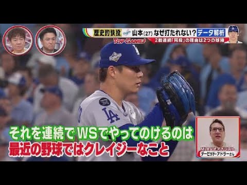 第のドジャーを救った山本。その覚悟に迫る。さらに [音楽] Jリーグ60 クラブの頂点が決定。決勝は圧巻のゴールが飛び出した。そしてミラのコルティナオリンピックまであと [音楽] [音楽] 97日。スピードスケート高が姉 7に明かした本ネとは 本当に多分覗かないと私多分北京の時よりどくさい気がするな。 [音楽] トップゲームはメジャーリーグワールドシリーズ第 6戦。 世界一へ大手をかけたブルージェイズの本拠地では この日ハロウィンということで コスプレをする多くのファンが ワールドシリーズ32 年ぶりの優勝というもけて いやがりも半端ないですからウ [音楽] [拍手] 後がないドスファンも気合い十 盛り上がるファントは対象的に先発の山本信は集中した様子で球場入り。 いつも通りのプレでやっていきたいと思います。 球団初の2 年連続世界一を目指すドース。先週のワールドシリーズ第 2戦。山本が歴史に残る回答を見せた。 39 弾トップのチーム打率を誇るブルーイズ打線を全く寄せつけない。 そして 105 級を投げワールドシリーズ日本投手初の関東ぶりとなるポストシーズン 2試合連続関東勝利を達成した。 その試合後1 枚の写真が話題に守護神として出番がなかった佐々が山本に土下げ座。その佐々は以前 毎回こう関してくれないかなと願いながらずっと試合を見てます。 その願い通り1 人で投げ抜いた山本に最大級の経緯を表した。 そんな山本の歴史的な回答。実はデートで見ると驚くべき秘密が明らかに。教えてくれたのは [音楽] MLB公式アナリストのアドラーさん。 [音楽] ポストシーズンでは調子が良くても先発が関するのは稀れなんです。 それを連続で、しかもワールドシリーズでやってのけるのは最近の野球ではクレイジーなことだと言えます。 山本の関東を支えたのは 2つの急所だという。 1つ目は 彼のカーブは際立っていると言えます。特にゲレロジュニアを三振に取ったあの一級はかなり良かった。 それは初回ホストシーズンで打率 4 割超えと校調のゲレージュニアを迎えたシーン。 [音楽] [拍手] 山本の武器のスプリットでゲレロジュニアを追い込む。そして [拍手] [拍手] 最後はカーブで空振り三振。 レギュラーシーズンではスプリットで多く 三振を取っていたが、この日は三振の半分 をカーブで奪った。 こちらはこの試合の山本の投球データです 。 カーブは縦に160cmも変化しているん です。 山本に関してはカーブの楽さが大きいだけ でなく横へも大きく変化します。 水平方向にはメジャーの右の平均より 7.6cm大きく曲がり、垂直方向には 平均より15cm大きく落ちます。 両方向でメジャー平均大幅に変化するので 、彼のカーブは非常に効果的なのです。 山本の関東を支えたもう1つの種が ゴを多くせたことも関にした理由の1つ です。 彼がポストシーズンでよく使いゴロを打たせていたのがカットボールです。 そのカットボールがこちら。ストレートと思ってくでしょ。 [拍手] ストレートと同じ動から小さく変化しバットのシを外す。 こちらは毎月のごとのゴのデータです。 この10月はポストシーズンのみの数値。 カットボールは72%と全球止で1 番ゴロ率が高い。彼のカットボールは右投資の平均よりも 2.5cmほど 大きく曲がります。その少しの曲がりの大きさがゴロの量産に繋がっているのかもしれません。ゴロを打たせると早めにアウトを取れるので長い回を投げることを可能にしたのです。 この日7回にはカットボールで 2つの内ヤゴに打ち取り、わずか 8 球で抑えるなど打たせて取るピッチングがカスを少なくし関東勝利につがったという。 その2日後の第3 戦、山本の世界一への覚悟がチームを拳した。 [音楽] 現地は夜の11時を過ぎ、試合は 6時間後 ドジャースはここまで当継ぎ込む総力戦。 [音楽] 10 人目のクラインは15回から4 イニングを投げ72 球。交代をしたいがベンチには投げられるピッチャーがいなかった。すると山本が驚きの行動に出る。 [音楽] [拍手] もうチャもいなかったんで行くしかないと思いましたし。ま、体調的にも。 そして延長18回古い立ったのが3番 フリーマン。 ブルペンでは最初10から15マイルほど で軽く投げていたと聞いた。 でも行けるかと聞かれ行けますと即頭する と次の一級を外格低めに97マイルで 投げ込んだらしい。あの姿こそを象徴して いる。勝つために全力を尽くす人だ。 彼がブルペンで投球練習しているのを見て、この試合で彼を投げさせてはいけないと思ったんだ。 [音楽] 試合開始から6時間39 分後。結構練習するわけです。 [拍手] [拍手] [音楽] うん。ね。 [拍手] [音楽] こういう時のこういう試合で投げれるよう にこれまで何年も練習してきたんで、ま、 19歳の時は1軍で何でもない試合で投げ てもそっから10日間ぐらい投げれなかっ たり、ま、そんな感じだったんですけど、 ま、そっから何年も練習して前回ワールド シリーズで関東して、ま、2日後にこう 投げれるような体になってたっていうのは やっぱすごい成長感じましたし、ま