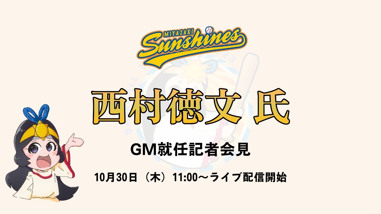 皆様、こんにちは。え、本日は宮崎 サンシャインズの記者会議にお越し いただきましてありがとうございます。え 、本日、え、進興を応せりました球団代表 しておりますと申します。え、本日は どうぞよろしくお願いいたします。え、ま もなくですね、記者会見を始めます。 恐れ入りますが、え、携帯番号を、携帯 電話をお持ちの方は電源をマナーボにして いただきますようお願いいたします。え、 それでは、え、開始までもうしばらくお 待ちください。 はい。 皆様、本日はお忙しい中、宮崎 サンシャインズ球団新ジェネラル マネージャー就任記者会見にお越し いただき誠にありがとうございます。本日 は11月1日より新たに就任いたします ジェネラルマネージャーについてご報告 申し上げます。 それでは登壇者をご紹介いたします。 宮崎サンシャインズ 球団代表堀の内一郎です。 はい、よろしくお願いいたします。 そして新ジェネラルマネージャー西村典です。 よろしくお願いします。 宮崎サンシャインズ監督元村信吾です。 よろしくお願いします。 どうぞよろしくお願いいたします。 それではまず宮崎サンシャインズ代表取締り役堀の内一郎よりご挨拶申し上げます。 失礼いたします。え、本日はお忙しい中、え、西村の、え、宮崎サンシャインズ GM ジェネレダムマネージャー新会見にご参考をいただきまして誠にありがとうございます。 日頃より宮崎3者の温かいご支援も重ねて 感謝申し上げます。え、振り返りますと、 え、過去3期、え、宮崎社員、え、宮崎を 元気にするという 思いのこと、え、戦いを繰り広げてまいり ましたが、なかなか思うような成績を 上げることができない、え、3年間で ございました。え、来シーズン4期目を 迎えるわけなんですけれども、なんとか、 え、これまでの悔しさを我に、え、 ステップアップをしたい。そのためには何 をすべきか、え、なんとか宮崎さんの 底上げを、底上げを測りたい。え、そんな 思いの中、え、ゼレナマネージャーとして 、え、西村さんをお迎えすることができ ました。え、ま、経緯といたしましては、 ま、彼よりですね、え、西村さんがこうし た地元宮崎のこの宮崎3者の戦いぶりに ついて、え、色々とあの気を配って いただいてたということも話をいただいて おりました。え、ちょうど西村さんが、え 、宮崎の方にですね、え、来られた際に なんとか今の現長をお伝えして力を犯かし ていただけないか、え、そうしたお願いを させていただいてですね、え、なんとか 故郷古さ宮崎のために、え、人方脱いで いただける、え、そんな、え、 力強いお言葉をいただいて、え、今回の 合意に至った次第でございます。え、 申し訳までもなく、え、西村さんは、え、 現役地帯、え、主打者、え、業など、え、 1000級でNPBで活躍をされました。 また現役引退後も、え、ロッテそして オリックスでですね、え、監督としてシを 振る、え、皆さんの記憶にもありますよう に、え、ロテの時代には、え、月場でです ね、日本一に輝く、え、そうした輝かしい 、え、経歴もちの方でございます。え、 何よりですね、私もして感じたのはその NPBの活躍にも関わらず我々のような 素事にもですね、え、同じ目線で色々と 話していただいて、またあの本当に紳摯的 な人柄というところに暮れさせていただい た中で是非ともそうした、え、石村さんに ですね、球団に加ばんでいただいてこれ からNPBの夢を見る選手たちのまた夢の 実現に向けてですね、より目標がクリアに なって意識が高まって、え、宮崎県そして 宮崎サンシャズのためにですね、選手たち がよりレベルアップしてもらえるんじゃ ないかなという確信を得たところでござい ます。え、GMとしてですね、現場、 そしてフロント、え、全般的に渡ってです ね、様々なアドバイス指導をいただく予定 にしておりまして、え、皆様方とのですね 、関われというものがですね、より高く なってくると思いますので、是非、え、 宮崎さんチャイズ、え、西者村さんとども 、え、来年のシーズンもですね、期待して いただければという風に思っております。 え、どうぞよろしくお願いいたします。 ありがとうございました。続きまして、 宮崎サンサンシャインズ監督元信吾よりご 挨拶申し上げます。 皆さん、今日は、え、記者会見来て いただきまして誠にありがとうございます 。ま、今回、え、新GMということで、え 、西島さんに来ていただくっていうことで 、え、現場サイドももちろんですけども、 え、チームの、え、内側外側全てに、え、 関わっていただいてチーム一眼となって ですね、え、この3年間悔しい思いにした 、え、チームもですね、なんとか、え、 盛り上げていけるようにですね、え、私も 、え、新GMにはですね、え、期待して ますし、またいろんなアドバイス、またご 指導、また、え、選手の能力についても ですね、いろんなご指導を受けながらです ね、え、やってい