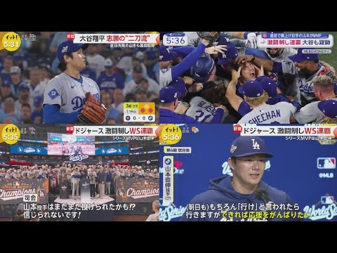 ドジャースが球団初の連覇を発達成です。 はい。え、ドジャース、そしてブルージェイズ共に視力を尽くした戦い。大谷翔平選手は二流出場。山本義投手は MVP 獲得の活躍で世界一に輝きました。大谷の慰霊の二刀流に山本は慰霊の連頭。 [音楽] [拍手] [音楽] 9 年ぶりに最終戦までもれたワールドシリーズを持てる力を出し切ったドースが大逆転撃で制しました。 [音楽] 勝ったチームが世界一となる 1戦に大谷が中3 日で志願の先発登板。二流でワールドシリーズ連覇に挑みます。 一方大谷の地元岩手県欧州市もパブリックビューイングを開催し声援を送ります。 注目の1 戦へ。まずは初回の先頭バッターとして第 1打席に望む大谷。センターへ [拍手] 2 試合連続ヒット。しかし後続が続かず得点は奪えません。そしてマウンドに登った投手。ワンアウト満塁とさよなら負けの大ピンチ。 [拍手] この打球を同点ホームランのロハスが高変。これで 2アウト。 続くバッターは山本も思わず座り込む大きな当たり。必死に打球を追うガイア人。最後はパスがスーパーキャッチ。試合は第 [拍手] [音楽] [拍手] 3戦に続く延長戦に入ります。 [拍手] その後も続頭を続ける山本を援護したい谷は延長 11回の力打席。 1 発の期待も高まりましたがここはセカンドゴに倒れてしまいます。それでもキャッチャーのスミスが対戦金の大仕事。 [拍手] 2 年連続の世界一へ勝ち越しのソロホームラン。これで初めてリードを奪ったドス。 [拍手] あとはその裏を抑えれば世界一 11 回も投げ続けた山本はランナーを背負いますが得意のスプリットでバットをりダブルプレイに抑えました。ドジャースが球団初のワールドシリーズ連覇達成。同上げ投手の山本はシリーズ [拍手] 3 勝目。志願の二刀流を見せた大谷と共にチームを世界一に導きました。 [拍手] そして迎えた優勝セレモ。 大谷も去年に続き 2度目のトロフィーを掲げました。 [音楽] 石山 [拍手] ワールドシリーズのMVP に選ばれたのは山本でした。 [音楽] ま、ブルペ行くまで投げれるか本当の自信はなかったですけどはい。なんかうん、もう分からないですけど。はい。最高です。 まさに総力戦となったワールドシリーズ。 山本は第2戦で関東勝利を納めると延長 18回の主頭となった第 3 戦でもブルペンに入る男ぎを見せ、昨日の第 [拍手] 6戦でも6 回を投げ切り勝利投資となりました。 もちろん、ま、行けと言われたらいきますけど、ま、できれば応援を頑張りたい。はい。 応援では済まなくなった最終戦。 慰例の連日登板でマウンドに登ると無視点でしげ切り。ワールドシリーズ 3勝目。松井秀さん以来日本人 2人目のMVPに輝きました。 え、もうできることは全部できましたし、ま、このチームで優勝できて本当にはい、嬉しく思います。 そして期のシャンパンファイト。 [拍手] 大谷が山本を抱っこし、日本人トリオで記念撮影をするとありがたいトロフィーに向かってこのポーズ。 [拍手] あの音欲施設も勝利の美種に酔うドジャースナに負けと大覇者 [音楽] さに世界一を伝える豪害も配布されました。 はい、もちろんです。 ありがとうございます。 おめでとうございます。 そしてドジャースの地元ロサンゼルスの街も換気に包まれました。 え、応援していただいて皆さん本当にありがとうございます。頑張って本当に良かったです。また頑張りますのでまたよろしくお願いします。 [音楽] この試合東田二刀流での出場が決まった大谷翔平島ブルーイズの手法ゲレードジュニアの球場入りの写真。 世界中が片を飲んだ試合は伝説の 1戦となりました。 え、第6 戦で高した山本投手最終戦の前にも練習を行ってます。え、隣には賞投手の姿もあります。お、佐々投手の姿です。え、今アップを始めました。 [音楽] [音楽] え、よいよ最終戦、え、総力戦で戦いに望みます。 3勝 3敗で迎えた運命のワールドシリーズ第 7 戦ジャースが団場初のワールドシリーズ連覇。それともブルージェイズが [音楽] 32年ぶりの制覇。大谷は 1番手県指名打者で出場。 1回先頭の第1打席はセンター前に運ぶ ヒットでチャンスを作ります。 しかしここは後が続かず先制点とはなり ません。 その裏小でマウンドに上がる大谷。 中3日での登板となりました。 1回は2 者連続三振を奪うなど無視点で切り抜けますが [拍手] 2回2アウト満塁のピンチを招きます。 [拍手] ガンゲンチを切り抜けるとガッツポーズを見せて吠える。 [拍手] 3回大谷は再びを招きます。 ランナー2人を置き4 番ビジェットエゴール [拍手] 特大の3 ランホームランを浴びると両手を膝についてだれる大谷。ここでマウンドを折ります。 [拍手] [音楽] [拍手] 2点差のまま試合は終盤の8回。 [拍手] マンシーのソロホームランで1点差に迫る と 最終9回でした。 [拍手] 土タ場でロハスが同点ソロホームラン。 ネクストバッターに控えていた大谷も両手 を上げ感情を爆発させます。 その裏ドアスはさよならのピンチ。ここで マウンドに上がったのは昨日の試合で先発
