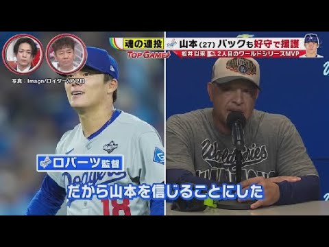 トップゲームはメジャーリーグワールドシリーズ団初の連覇か 32 年ぶりの世界一か ついにやってきました 7戦闘上がりです。 [拍手] [音楽] 決戦地カナダのブルージェイズファンはレゴー 一方ロサンゼルスはドーム型のスクリーンに映像が移しらされ、まるで球場にいるような没入感を体験できる施設な。 ちょっと行ってみたい。 確かに。 え、そこには今日もドースファンの姿がえ、共に [音楽] 3勝3敗勝った方が世界一となる最終第 7戦。うう。ドジャースのマウンドには中 3日での先発となった大谷翔平。 2 回2アウト満塁のピンチ。 ちょっと変化球がね。 ちょっとね、球がワ [拍手] 三振を奪いおたけび火を上げた大谷ね。なんかリアルだもんね。 [音楽] [拍手] スタジアムが1回ここに行ってみたいさ。 へえ。 ドジャスタジな。 しかし3回再びチを招くと大セルは 4番ビシェット。その初球だったもんな。 [拍手] 通コンの先制3 ラを許すと膝に両手をつきれる谷。見ないですね。 先ほど大盛り上がりだったドースファンも息ね。 3点は結構しんどいっすよね。でもね、 ピッチャー大谷は3回途中51球を投げ3 失点。ここで交板となります。 それでもその後とエドバンの犠牲プライで得点を奪い 2対4で迎えた8 回ブルーズのマウンドにはルーキーのイエサベージ 上さん覚えてますか?3日前の第5 戦に先発したイエサベージはドース打線を圧倒 覚えてないわけないじゃんかつい数日前のこ [拍手] だった12個だね。 [拍手] 7回12 脱三振でドースの前に立ちかった強敵。 ワンアウトから打席ば前回の対戦ではノーヒットだったマンシー [拍手] [音楽] うん。こ盛り上がりそうだな。本当に 試合終盤に1点差に迫ったドースですね。 するとブルペンには昨日先発した山本義の姿が俺でも多分本当にこうピッチング練習してるだけで出ると思わなかった。 その山本は昨日 6 回1失点96球の後で今シリーズ 2勝目最終戦へぞみをつぐピッチング。 明日もし中継が抑える必要とされたら投げられると思いますか? もちろん。ま、行けと言われたら行きますけど、ま、できれば応援を頑張りたい。 はい。お願いします。 F 投げると。 しかし1 が開けた今日の試合前、山本がロバーツ監督に衝撃の発言をしたと言います。 山本信がブルペンで準備を進める中、 1点ドジャースは9回を表 あとアウト2 つで連覇の夢が途える追い込まれたド。ここで ヤシチーム最連長のロハスが見せます。 [拍手] 9番ロハスがドタバれ先金のホームラン [拍手] [音楽] うん。 世界1 が目前に迫っていたは当然。一方連覇の望みがつがったドースのロサンゼルスはお祭り騒ぎ。みんなで喜びを分かち合います。 [拍手] そして9回裏。ワンアウト2塁1塁。1 点も与えられない場面でマウンドに上がった山本義。場 面ですもんね。まずね、 当時の心境について、 ま、ブルペンで作り始めた時はまだ、え、ぜ、あの、投げれるっていう確信がなくて、ま、 7 戦という試合で絶対落とせなかったんで、ま、その責任もありますし、どうだろうっていうまだ、ま、迷いというかうん。ま、そういったのがあったんですけど 迷いはあったという連頭の山本は先頭のカーにいきなりボール。ワンアウト満塁。ピンチは広がります。 [拍手] それでもね [音楽] セカンドゴールに仕留め2 アウト。これした。 [拍手] さらに続くピーチ。クレメントへの初球。 [拍手] これまと思ったけどね。いや、よく取ったよ。よく取った。 [拍手] [音楽] この回から守めで入ったフェスが引けヘルなんですと工作しながらもキャッチ。 満塁のピンチを無視点で切り抜けます。 うん。 延長に突入した10 回もドースのマウンドは山本。今日 3 アダのスプリンガーに対し得意のスプリットで三振。この回も無視点。すると [拍手] 11 回の表ジャースに配望の瞬間が訪れます。 [拍手] キャッチャーミルスミスがホームラン。 ドジャースが今日初めてリードを奪います。疲れないね。 [拍手] そして連覇がかかる11回裏。山本は3 イニング目のマウンドへ。 遅れ出したロバート監督は 世界1あとアウト3つ 立ちかるのはボストシーズン絶好調レエロジュニ さすがだったけどうまくいってますよね。 [拍手] 155kmのストレートを弾き返され 2 ベース続くカイナーファレファはバントワンアウト 3 塁とピンチは広がります。さらにバーガーをストレートで歩かせた山本。 [拍手] 1打逆転となる場面でポストシーズン5本 のホームランカーと対決。 山本が通した34球目。 [拍手] ドジャスが球団試場初のワールドシリーズ 連覇を達成です。 いや、しびれだね、本当に。 日本選手の活躍が大きかったこのポストシーズン。 ホームラン。 大谷は球団記録8本のホームラン。 山本は2つの関東を含む5 勝を上げ、防御率も 1点台。 佐々木はリリーフとして防御率 0点台。3つのセーブを上げました。 [拍手] 優勝セレモニーの前には大谷が山本の帽子を直してあげる姿も。 そしてワールドシリーズMVPは [音楽] [拍手] 山本が2009 年の松井秀さん以来となる日本選手 2