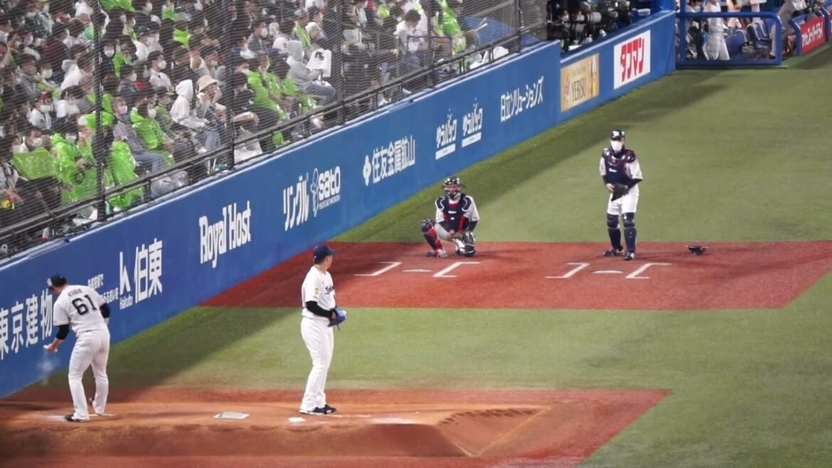 7回表 清水昇投手、久保拓眞投手がブルペンで投球練習を始める。