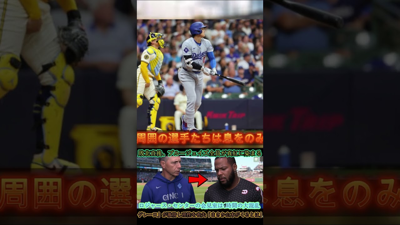 最後の打球が左翼のグラブに収まり、試合 終了のコールが響いた瞬間、観客席を 埋め尽くしていた青い波が凍りついた。 スコアボードには5、非4ドジャースの 勝利の文字が点滅し、ドースの選手たちは 一斉にマウンドへと駆け寄った。換期の輪 の中心にいたのは139を投げ抜いた山本 義信。その少し離れたベンチの橋では カナダの英雄裏じールゲレージュニアが タオルで顔を覆い身ぎもせず横たわってい た。彼の方がかかに震えていた。隣に座る ビットがそっと背中に手を置いたが、 ゲレーは何の反応も示さなかった。周囲の 選手たちは息を飲み、涙をこらえる彼の 横顔をただ見つめていた。あの祠らしげで 無邪気な笑顔はもうどこにもなかった。 ほんの数分前まで観客を熱狂させた英雄は 今静かに敗北を受け入れていた。試合後の 記者会見ゲレーはゆっくりと椅子に腰を 下ろし深く息を吐いた。短い沈黙の後かれ た声で口を開い
