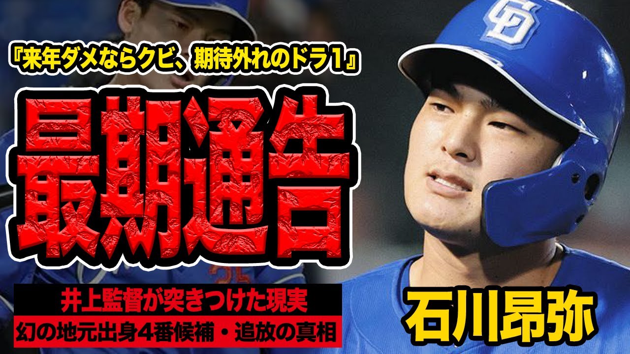 石川高に最後通告。地元ドラ1の最悪な 2025年シーズンに首脳人が見切りを つけることを明言したのです。2019年 ドラフト会議3球団が競合したその才能に ドラゴンズファンは未来の余番ミスター ドラゴンズの姿を夢みました。東方高校を 支援の頂点に導いた地元のヒーロー石川。 あれから6年は今残酷な現実を突きつけ られています。 監督は石川選手に来のたしを通告しました。これは単激例でしょうか?いえ、違います。これは崖プチに立たされた男への事実上の最後通告です。なぜあれほどの才能がプロ入りわずか 6年にして戦力外の 3 文字を突きつけられる瀬戸際にいるのか。期待はいつから失望に変わったのか。 この動画では 2025 年に彼が残した絶望的なまでの成績を徹底的に解剖し、彼がなぜキャリア最大の路に立たされているのか、その明確な根拠をデータと共に深く鋭く掘り下げていきます。 2025年10月25日、井上和監督は 左脇通でリハビリを続けていた石川高選手 を11月1日からのコーチ周期キャンプに 対道させることを明言しました。一見する とこれは不審の相手に対する音のようにも 聞こえます。しかしその言葉の橋ばからは 温かさとはほど遠い突き離すような厳しさ がにみ出れていました。高知人が絶対 大丈夫です。って言うから高知のメンバー に入れるこの言葉は監督自身の判断という よりも高知人がそこまで言うならという 条件付きの許可であったことが伺えます。 そして監督の口から出たのは期待ではなく 数列な指摘でした。ここから少ししかない 。行くぞの時に脇腹をやる。何かにつけて そこをどうしたら打破できるのかを本人も 考えてもらわないともう待ったなしでしょ 。待ったなし。これほど重い言葉がプロ7 年目を迎えようとする。かつてのドラフト 1位選手に向けられるでしょうか。これは これまでの6年間、特に2025年 シーズンに対する最大限の警告です。 行くぞの時、つまり最も重要な局面で怪我 を繰り返す。その何かにつけてという部分 に首脳人の深い苛立ちと低感すら感じられ ます。井上監督はシーズン報告の場で大島 オーナーに対し地元から1位指名した若手 の底上げを約束したと報じられています。 しかしその期待を最も裏切ったのが他なら ぬ石川選手だったのです。この待ったなし 発言は裏を返せば来 を繰り返せばもう次はないという事実上の 戦力外通告に他なりません。ユニフォーム を脱ぐかあるいは育成契約という屈辱を 受け入れるか。彼はその崖けっプチに 立たされたのです。では、なぜ井上監督は ここまで厳しい言葉を突きつけたの でしょうか?それは2025年の成績が 期待外れという生優しいレベルをはるかに 超越していたからです。新井上大戦が スタートした今期石川選手は不動の4番 サードとして指名されました。これは チームの不沈を彼に託すという監督からの 最大の信頼の証でした。しかし、彼はその 信頼をシーズン開始わずか2週間でドブに 捨てたのです。開幕から13試合、深刻な 打撃不審で4月12日には早々に2軍、5 月末に最小格を果たしますが、わずか8 試合で再びファームへ。そして9月3日、 バンテリンドームでの阪神戦1軍復帰を 果たしたその試合で今期1号となるホーム ランを放ちます。ファンはここからだと誰 もが拳を握りしめました。しかしその翌日 、彼は左脇腹を痛め、先線を離脱、その ままシーズンを終えました。最終成績は 22試合出場打率1割3部林、1本Vだ点 。CBCテレビのシーズン総括記事では 井上監督が思い描いたセカンド福永サード 石川、ショート村松という内野構想が怪我 と不審で崩壊したことを第5といます。 その中でも4番に据えた石川選手の脱落は チームにとって最大の誤参であり、致名的 なダメージとなりました。これはスランプ ではありません。プロの一軍レベルで戦う 準備が技術的にもそしていくぞの時に脇腹 をやるというフィジカル面においても全く 整っていなかった。これは壊滅的な失敗と 断言する以外にないあまりにも惨目な シーズンでした。 [音楽] 石川選手は2025年シーズンを終え24 歳プロ7年目を迎えます。一部のファン からはまだ若い地元スターを簡単に見切る なという用語の声も聞こえてくるかもしれ ません。しかしプロの世界は結果が全て です。過去のデータを見れば戦力外通告を 受ける選手の平均在籍年数は約7年。彼は すでにその平均に達しようとしています。 ドラフト1位という経歴は1年目、2年目 こそ大きなアドバンテージになりますが、 6年も経過すればそれは期待に答えられ なかったという思い足かせにしかなりませ ん。彼が危険推域にいる根拠は年齢や経歴 ではなく、そのパフォーマンスの絶望的な 内容にあります。25年の打率1割3部輪 という数字もちろん低いですが問題の本質 はそこではありません。彼の打席内容その ものがプロのレベルで機能不全に陥ってい たのです。注目すべきは打者の貢献度を 示すOPSです。彼のOPSはわずか 382。これはレギュラー選手としては 