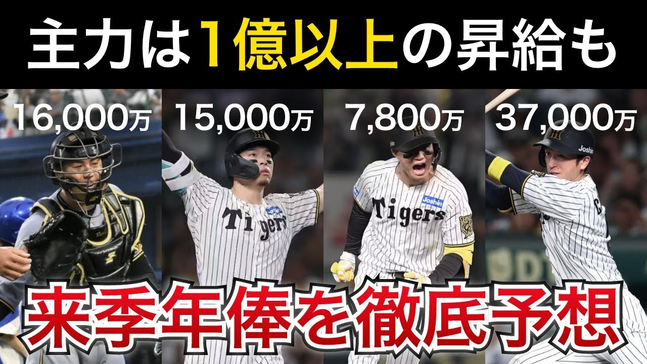 日本1こそ逃したもののぶっち切りの強さ でリーグ優勝を果たした藤川タイガース。 当手3巻を達成した村上選手や本塁打王を 打点王の2巻を獲得した佐藤明選手を筆頭 に大幅アップを狙える選手が数多います。 一方結果を残せなかった中堅ベテランも 多く明暗がくっきり分かれる契約公開に なりそうです。今回の動画は野編とし主な 14選手の来シーズンの年方を予想してみ たいと思います。是非皆さんの意見を コメント欄で教えてください。なおすでに 2年総額5000万円で残留を表明した 上田選手、複数年契約を結んでいる大山 選手、坂本選手は今回の予想には入ってい ません。ではまず出場の少なかった選手 から順に見ていきましょう。是非皆さんの 意見をコメント欄で教えていただけると 嬉しいです。1人目は中川選手です。高卒 1年目から2軍で悲な打撃センスを披露し 、3年目の昨シーズンは打率3割2部1輪 、OPS0.920をマークした中川選手 。そのバッティングを生かすために外野 守備にも挑戦し、外野手として待望の1軍 デビューを飾りました。当初はなかなか ヒットが出なかったものの、8月は20 打数6アンダ、9月は19打数7だと着実 に数字を伸ばし、最終的には25試合で 打率2割6部8輪日本塁打OPS 0.686をマーク。高卒4年目としては 十分すぎる成績を残し、来シーズンの ブレークを予感させます。そんな中川選手 の今期の推定年は540万円。の年方は 360万円アップとなる900万円になる と予想しています。7月中旬からシーズン 終了まで1軍に対し続けたことを考えると これくらいの査程になるのではない でしょうか。首脳人の配慮もあったのか 新人王の資格も残っているので来シーズン はさらなる飛躍に期待したいですね。続い ては島田選手です。過去4年間で300 試合以上に出場するなど重宝されてきた 島田選手ですが、今シーズンは出場機会が 激減。わずか28試合の出場にとまり、 打率1割2部輪と全く結果を残せません でした。総塁での致名的なミスもあり、 本人にとってもかなり悔しい1年だったと 思います。日本シリーズでは存在感を示し ましたが、厳しい査程になるでしょう。 そんな島田選手の今期の推定年は 3300万円。来の年方は800万円 ダウンの2500万円になると予想してい ます。原方制限を超える形になりますが、 これくらい厳しい査程になるのではない でしょうか。続いてはトヨタ選手です。 藤川監督に就任当初から評価され、主に右 の代打として起用された豊田選手。7月3 日の巨人戦では守護神のマルティネス選手 からさよなら犠牲フライを放つなど印象的 な活躍もありました。最終的にキャリア牌 となる33試合に出場し、打率2割3部2 輪という成績。物足りない数字ではあり ますが左当手に対しては打率2割キューブ 2輪と結果を残し左キラーとしての可能性 を示しました。レギュラーシーズンでは 総塁で日本シリーズでは守備のミスで挑伐 交代を命じられるなど課題も多く、来 シーズンも代打中心の起用になりそうです 。そんなトヨタ選手の今期の推定年は 830万円。大期の年方は270万円 アップの1100万円になると予想してい ます。続いては梅野選手です。坂本選手の 対当もあり、ここ2年はいずれも100 試合未満の出場に終わった梅野選手。4年 契約の最終年ということで、今シーズンに 向けては相当な思いで準備してきたと思い ます。開幕当初はスタメンの機会が多かっ たものの徐々にベンチスタートが増える形 に結局プロリゴ2番目に少ない52試合の 出場に終わりました。坂本選手の半分以下 の出場数でかなり厳しい立場に置かれてい ます。そんな梅野選手の今期の推定年は 1億6000万円。大期の年方は50% ダウンの8000万円になると予想してい ます。長年の貢献は評価されると思います が、この4年の結果から考えるとさすがに 大幅ダウンは避けられないでしょう。保有 しているFA権を行使するのかという点に も注目です。 続いては糸原選手です。昨年オフにFA権 を取得したものの行使せずに残留を決断。 複数年契約のオファーを持し、短年契約で 勝負のシーズンに望みました。しかし キャリアワーストとなる61試合の出場に 終わり打率2割3輪OPS0.456と いった指標もキャリアワースト。野球人生 の分岐点とも言える重要なシーズンは かなり厳しい結果となりました。そんな 糸原選手の今期の推定年は7000万円、 来の年方は20%ダウンの5600万円に なると予想しています。数字は良くなかっ たもののほぼフルシーズン1軍に対して おり、原方制限を超える現法はないという のが私の予想です。続いては高テ選手です 。過去2年間は一軍出場がなかったものの 、藤川監督は衆任当初から高く評価。5月 終了時点で20重打数に編んだと全く結果 が出ていませんでしたが、我慢強く起用し ていました。すると徐々に適用し、8月は 13試合にスタメン出場して打率2割 キューブ4輪OPS0.831をマーク。 トータルの打率は2割3部1輪でしたが、 ほぼフルシーズン1軍に対してキャリア杯 となる67試合に出場するなどブレイク