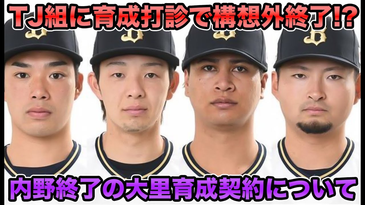 はい、どうも。では授業始めていきま 。 長期離脱組のTJと支配枠 ということでございまして、ま、最近 オリックスあの、え、慌た正しい、え、 支配化状況について話そうと、え、いう話 でございます。はい。ちょっとオリックス 1を結構ざわざわさせてるんじゃないかな と、え、いう風に思うんですけれども、ま 、いろんなことが考えられるというかです ね、このままでオリックス終わるんかい 終わるわけないよなっていう、え、内容な んで、ま、しっかりとですね、ここは、え 、お話をしていきたいなと、え、思うん ですけど、まずですね、じゃあことの経緯 というかトミジョン、トミジョンじゃない ですと、育成に、え、落ちた選手から、え 、行きますかということで、え、見ていき ますけど、はい。え、まずですね、4人 育成支配育成になりましたということで、 え、宇川投手と小田、そして東山投手は、 えっと、トミージョなので、ま、全くもっ てあの、想定ないなんですけども、まさか のですね、大里選手、え、も、え、育成攻 ということで、えっと、フェニックス リーグ中に怪我をしてですね、方を、ま、 手術したというところもあって、あの、 長期離脱、え、シーズン中に変えて来れる のかどうかみたいなところを言われてたん です え、まさかのですね、あの育成打信という ことで、ま、手術しっかり直して、え、 帰ってきてねっていう風な、え、ところだ とは思うんですけど、間近かいなという ことでございます。はい。ま、これで ちょっとあの 山ってるんですけど、なんならあの吉田 構成大丈夫なんだっていうのもね、え、1 つあるんですけど、ま、あの吉田高自身は あの8月にもうブルペンでガンガン投げて んですよね。で、SNSとかでも、あの、 もう投げてる、もう力強いボール投げてる のとかも、あの、アップしてるんで、ま、 人によってね、この治り具合ってのは もちろんそうなんですけど、え、違うんだ なっていうのをちょっと改めて感じました けど、ま、吉田高成は大丈夫だから支配化 のままなんだろうなって、ま、要するに こう戻ってくるからね、今シー来シーズン か。え、戻ってくるから、え、ていう ところなのかなと思ったんですけど、 ま、それがちょっと朗法ちゃ朗法なんです よね。全員育成になんのかみたいなところ もあったんで、そこがちょっとどうなのか なとは、え、思ったんですけど、え、裏川 投手がですね、これ、あの、トミージョン 手術してるのが3月なんすよ。確か1番 早いはずなんですよね。これ3月なんすよ ね。で、 ごめんなさい。吉田高晴が2月やったんで 1番早かったです。吉田高晴が1番早いわ 。え、吉田高晴が2月、そして宇田川が3 月、そして、え、小板投手が4月っていう 風な、え、状況になってるんで、ま、この 1ヶ月の差なのかわかんないですけど、 だったらまあね、え、裏側もそのまま試合 がだと思うんで、ま、人によるのかもしれ ないですけども、ま、そういう状況になっ てますよと、え、いうことですね。で、 それだけじゃなくて再気投手が右肘 クリーニングということで、ま、ここに 関してはあの開幕一軍入りを目指して、え 、万全な状態でっていうところだと思い ますし、ほんまにやばかったらね、来年も おるよねって動画作ったと思うんですよ。 士だったら、ま、あの、もっとやばかった 同士し、もっと早めにね、なんなら シーズン中に、シーズン終わる前にそう いうこう怪我とかなっててもおかしくない と思うんで、ま、ここに関しては大丈夫な のかなってので、ま、今回取り扱ったこの 4名ね、このトミージョン組の3人川、 小田、東山、そして大里選手の、ま、支配 育成攻がかなりちょっとざついてると。で 、ま、言いたいのがですね、これで オリクス終わらんよなっていう話なわけ ですよ。何が終わらんかって言うと、ま、 戦力外の話でなんですよね。で、現状は、 ま、予想通りの時期に予想通りの発表し ました。で、支配枠で見ていくとですね、 これ60今4なんですね。ただし、え、 これ経緯を見ていくとシーズンが終わった 時は69で第1次、第2次合わせてですね 、えっと、支配が6名、え、高画にしまし た。福田集平、玄佐能、そして、え、 ダブルホンダに、え、イ口ということです ね。で、えっと、オリバレスとディアスの 対談で-2で61なんですけど、えー、 ここにプラスで7名支配ドラフト指名し ましたね。68で、今回の4目で64な わけですよね。で、ま、補足書いてますが 、え、まず、えっと、支配6人に対して ですね、現と本田瞳に関しては育成打信を してます。で、外国人に関しては対談文が 、え、そのまま加入すると思うので、 プラマイ0ですね。で、えっと、 トビージョンに関しても、え、カ地試合で 昇格をするってことを考えるとですね、 ここに川チ投手もいるわけですよね。だ から、え、2+2+4+1してください。 なんぼすか?なんぼや?う、えっと、7 ですね。7でやってるね。そう、7