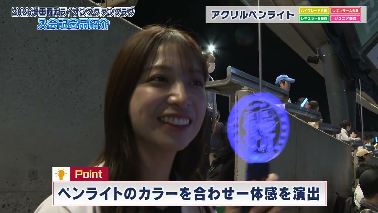 さて、ライオンズは2026シーズンの ファンクラブ入会受付を開始しました。 ファンクラブに入会すると感染チケット 引き換えクーポンや色々なサービスが受け られるんですが、やっぱり何と言っても 楽しみは入会記念グッズですよね。という ことで今回は入会記念グッズを紹介して いきたいと思います。 ファンクラブに入会するともらえる入会 記念品。毎年思考を凝らしたグッズで僕 たちをワクワクさせてくれますが、今回は どんなラインナップが揃っているの でしょうか。 まずは荷物が多い人にはおすめのボストン バッグ。これ1つでタオルやフラッグなど 何でも入っちゃいます。 さらにベルーナドームの椅子の下に ぴったり収まるサイズなので置く場所に 困らないのもいいですね。 続いてはスタジアムジャンパーです。 こちらワンポイントのレオマークが アクセントになっていて、とっても可愛い です。あの、着心地はですね、すごく軽く てふわふわしてるんですけど、北感すごく あったかいので、春先すごく使えると思い ます。 まだ肌寒い春先に重宝しそうな スタジアムジャンパー。シンプルな デザインなので感染はもちろん。 普段使いもできそうなので持っていて損はないと思います。 続いてはじゃん。ブルーのとコラボしたステンレスボトルです。こちらシンプルなデザインなので仕事や学校など普段使いにもいいんじゃないですか? シルバーのボトルにレオマークが映えるステンレスボトル。 サイズも480ml と持ち運びも区にならないので色々な場所 に持っていけて便利ですね。 続いては住田投手、竹内投手、西川選手、 滝沢選手がプロデュースしたトートバック です。選手の個性がそれぞれ出ているので 1つずつ紹介していきます。 まずは住田投手プロデュースのトート バックです。見てください。 こちら住田投手の東急ホームにベルーナドームへ行こう。そして裏はじゃん。背番号の 16番が書かれております。 そして住田投手のこだわりはですね、片方のペットボトルホルダーが捕ができるペットボトルホルダーになっています。背中も広いのでたくさん物も入ると思います。 ここのチャックが付いてるのも嬉しいです ね。 続いては竹内投手のプロデューストート バックです。こちら竹内投資の苦顔が 真ん中にありまして、その他にはナツキと いう文字がたくさん書かれております。 そしてこのペットボトルホルダー上がるの もすごく便利ですよね。あとは、あの、他 のトートバッグ見てもらったら分かるん ですけど、竹内投手の箱コンパクトなので 持ち運びがすごくしやすいと思います。 続いては背番号51番西川選手の プロデューストートバックです。背番号の 51番の真ん中に西川選手のバッティング ホームがありまして、反対側はじゃん。 西川、まとローマ字で書かれています。 そして西川選手のこだわりはですね、 こちらの透明のこのホルダーにですね、 感染チケットや携帯電話など小物を入れ られるようになっております。そしてです ね、中を開けてみると じゃん。こちらフラッグがさせるように なっております。 そしてこの肩かけができるのもすごく便利 だなと思います。 続いてはジャン滝沢選手のプロデュース トートバックです。こちら反対側はですね 、じゃーん。 可愛い滝沢ナ尾選手の苦顔が書いてあり ます。そしてですね、こちら開くと中に ホルダーも付いているので本物も入れられ ます。 すごく可愛らしい滝沢選手らしいデザイン ですよね。 続いてはじゃん。何枚やっても困らないバスタオルです。今回はシンプルなコンとレオが爆天している柄の 2種類です。 毎年大人気のバスタオル。今回は白と水色のボーダーの上にレオがバック点している可愛い柄とコンをベースにレオマークが入ったシンプルな 1枚。 何度も言いますが、バスタオルは何枚あっても困りませんよ。 1 枚は絶対に持っておきたいホームユニフォームーナドームでの感染では欠かせないアイテムですよね。そして今回注目なのは こちらのアクリルペンライトです。見てください。レオとライナが映っていてめちゃめちゃ可愛いんです。そしてこちらボタンを押すと色を変えることができるんです。 7色に変わるペンライトが入会記念品初 登場。応援の時に振るのもよし、SNS に上げるのもよし。用途は森沢さんです。 そしてペンライトが1番必要になるのは ヒーローインタビューが始まる前。お待た せしました。ヒーローインタビュー。今日 はペンライト青で迎えてください。 ヒーローインタビューの時にペンライトの 色を合わせ一体感を演出するんです。取材 の日は青だったのでベルーナドームが綺麗 なブルーに染まりました。これをやってみ たいという方は是非ペンライトを選んでみ ては。では紹介した記念品がもらえる コースを紹介していきましょう。ハイ グレート会員は年間費1万2000円で ボストンバックやスタジアムジャンパー などご覧の3種類の中から1つ。そして 選手プ