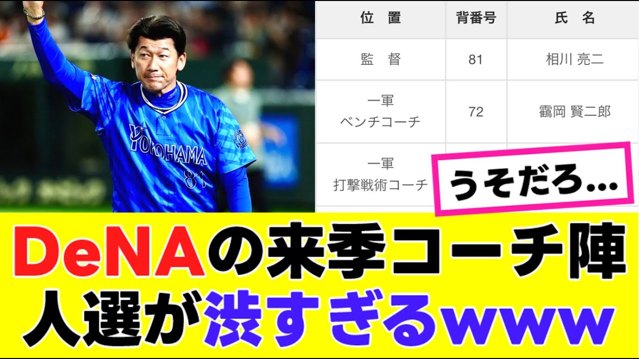 [音楽] DNAのキコチ人戦が渋すぎる。 DNAは1日大期2026年シーズンの コーチングスタッフを発表した新監督には 相川領氏が就任一軍では鶴岡健二次郎全王 オフェンスチーフコチガベンチコチに昇格 しデータ野球を守備面でも推進する打撃 戦術コーチには中井大輔し全任軍 オフェンスチーフコーチ合衆人大村岩が 打撃育成藤高市とか川田ウ助市が守備総塁 を担当し洋がチーフ投資戦術育成コーチを 務める投手コーチとバッテリーコーは後日 発表予定2は監督に村田一コチに田中博市 が就任新道達上田吉 市作八市鈴木高典氏柳田白が [音楽] 各分野 を担当する全体ではマネが安コーディネーター大原氏が投資コーディネーター氏が巡にク成功地を務めるこれに対し次のような声が上がっている 誰とは言わないけど一部コ知変えないと本当に勝てない 富の肩書きは中心回打撃育成功値にしてほしい。 [音楽] 投収やら守備面が今年より悪くなりそう。 少しぐらい外部から呼ぶのかと思ってたのにこれじゃ去年より悪化してるぐらいじゃないのか。 振動がファーム行って拾と立場逆転したの意味。 言い方良くないけどこの高知人で本当に優勝狙えるのか?もしかして人ないのか? [音楽] よかったら高評価お願いします。 [音楽]