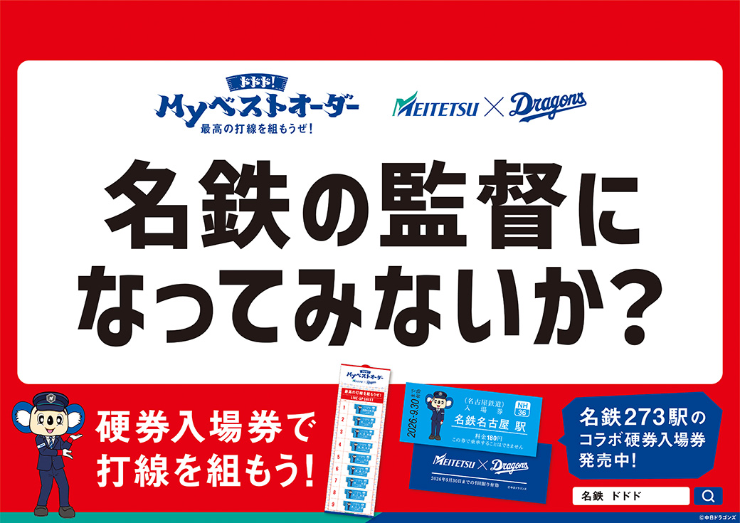 中日ドラゴンズのオフィシャル・パートナーである名古屋鉄道株式会社は、11/1より、「ドドド!Myベストオーダー」キャンペーンを実施中。