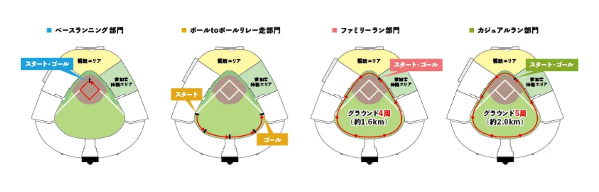 本イベント恒例の「カジュアルラン部門」、「ファミリーラン部門」に加え、今回は小学生のお子さまを対象にダイヤモンド1周を駆け抜ける「ベースランニング部門」、4人1組で外野ポール間の人工芝をリレー形式で走る「ポールtoポールリレー走部門」を新設しました。いずれの部門もランニング体験だけでなく、グラウンドレベルでの記念撮影をお楽しみいただけます。