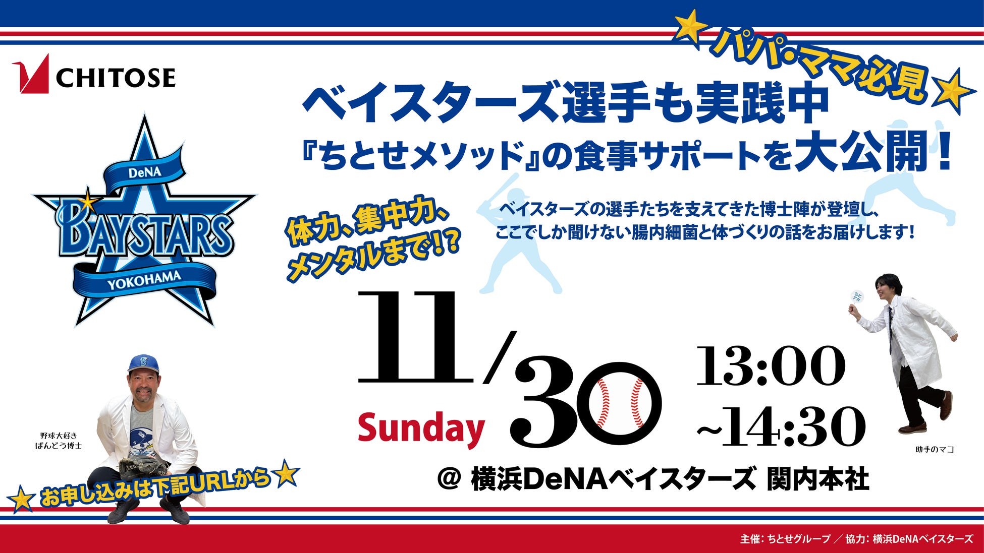 体力、集中力、メンタルまで!?ベイスターズの選手たちを支えてきた博士陣が登壇し、ここでしか聞けない腸内細菌とカラダづくりの話をお届けします!選手の活躍を支えた腸内細菌の底力と、それを引き出す食事法について実例を交えて解説。キッズアスリートにも応用可能です。博士と一緒に楽しく「腸から整えるカラダづくり」を学びましょう!