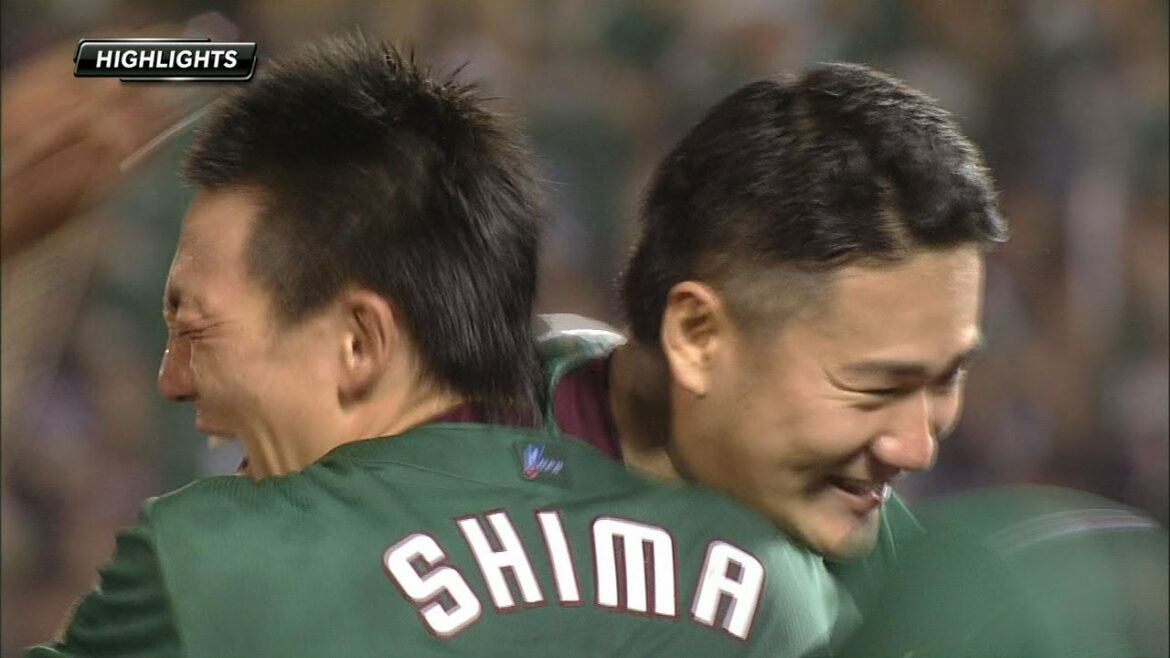 2回に両チームともにソロホームランで1点ずつを取り合った一戦。6回に井口資仁が楽天の先発・田中将大から日米通算2000本安打目となる第19号ホームランを放ち、千葉ロッテが1点を勝ち越す。ここまで開幕13連勝の田中は、9回を投げ切るもチームはビハインドのまま。しかし、9回裏に松井稼頭央が押し出しのフォアボールを選ぶと、続く嶋が値千金のサヨナラ打。田中将大に開幕14連勝をプレゼントした。(2013年7月26日 楽天イーグルス対千葉ロッテマリーンズ)