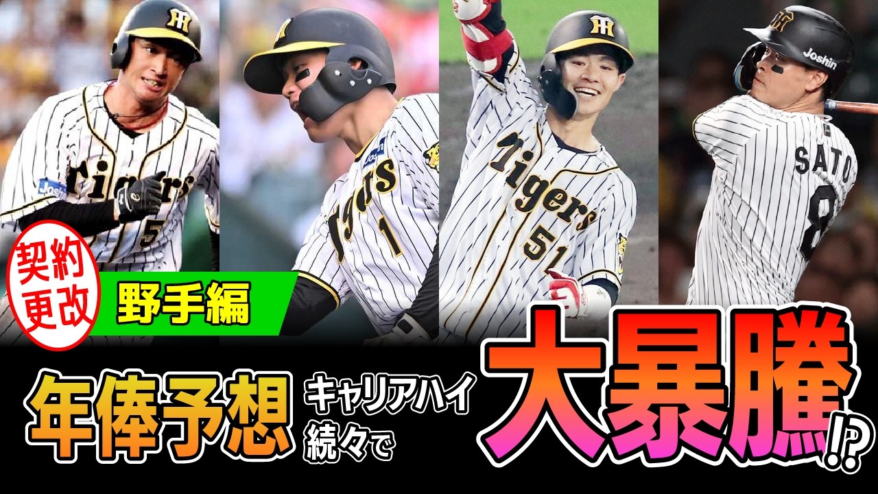 前回の投手編に続き、今回の動画では年方 予想の野手編をお届けします。投手編を まだ見ていない方は是非こちらの動画も ご覧ください。今年の阪神主人は打撃2間 のタイトルに輝いた佐藤を筆頭に1番から 5番までがっちりレギュラーを固定できた 点がリーグ優勝できた大きな要因なのは 間違いありません。打者がしっかり与え られた役割を果たしたことで年間通して 安定した戦いができセリーグを圧倒しまし た。残念ながら日本一は逃した阪神ですが キャリアハイの選手も出た今年のシーズン バラ色のオフを迎える選手も多いでしょう というわけでレギュラーを中心に早速野種 の年予想をしていきます。まずは 毎年キャリアハイを更新し続けているあの 選手です。森下太 ルーキイリアーの2023 年からレギュラーを掴み、毎年着実にレベルアップしている森下。今年は主に [音楽] 3 番として全試合に出場し、チームを勝利に導くバッティングを何度も見せてくれました。交流戦では打率立を 2割台 前半と調子を落としたもの夏場から勝負の空口にかけて調子を一気に上げ最終的に本塁打点 [音楽] アンダスなどの目でキャリアを成します。 そ田森下の来の年方は7200万円アップ の1億5000万円と予想しました。 打天王のタイトルはお惜しくも チームメイトの佐藤に阻まれる形となった 森下ですが来年は何かしらのタイトルを 獲得してくれる期待が高い選手です。 ちなみに今回予想した4年目で 1億5000万円という数字は兄貴気分の 佐藤照明の4年目シーズンの推定年と同じ 金額でした。 森下地震もおそらく佐藤の年推移と自身の年推移は比較しているのではないでしょうか。続いては今年見事に復活したあの選手です。 中野 昨年の打率がまさかの2 割台前半と大不審に陥った中野。 2024 年に優勝を逃した大きな要因として中野の不信を上げる人もたくさんました。しかし今年は埼タアンダを獲得した一昨年のような打撃を取り戻し、見事優勝の立役者の 1人となりました。そんな中野の来の年方 は7500万円アップの2億2000万円 と予想します。今年の中野は総行士に 素晴らしい活躍を見せてくれました。打つ だけではなくリーグダトの最だ。そして何 と言っても難しい甲子園のセカンドという ポジションながら年間のエラーがたった2 つという守備力でいく度となくチームを 救いました。23 年にボールデングラブを獲得した年都年ですら 9 個のエラーを記録しているのでいいかに今年の守備がすごかったかが分かります。選手会長もなど今年の中野はまさに明日とも [音楽] 2 チームの中心選手でした。ここからは今年のショート争いをした 3選手を一気に予想していきましょう。 小端平。 今期ショート争いをしたメンバーの中で最も試合に出場したのが小バです。 自身キャリアとなる89試合に出場し、 ホームランも5本放ちました。そんな小端 の来の年は2000万円アップの 3500万円と予想します。出場試合数は 増えたものの2割2部3輪と打率はここ3 年では最低となりケースバッティングが できない打席も多く見られました。また 守備でもとてつもないサインプレイをした と思いきや平凡なゴロを悪送給するなど不 安定な面もまだまだあります。 大機のショートのレギュラー候補 1 番手の選手だと思うので、小バタがどれだけ成長できるかが連覇のポイントかもしれません。続いて今年一気にスタメンの機会が増えたあの選手です。 熊ガ高弘 黒入りしてから昨年まで通算 111 打席だった熊ガですが、今期はスタメンの機会が増え 1年間で170 打席に立ちました。ショートとレフトのレギュラーがなかなか固定できない中、熊外の存在感が非常に大きかったシーズンでした。 そんな熊の来の年は1100万円アップの 3000万円と予想します。大外やどこで も守れるユーティリティさは監督にとって もとても頼もしい存在だったのではない でしょうか。チームにいろんなオクション を与えてくれる貴重な存在として大機も マルチに活躍してもらいたいですね。続い て2年続けて苦しいシーズンとなったあの 選手です。せや2023 年の大活躍したは影をめ、今年の打率はなんと 1 割台でシーズンを終えます。また少ない試合数ながら旧止策をするなど講手において制裁を書きました。そんな並の来キの年は 1500万円の 5000万円と予想します。 2 年続けて厳しい成績となった。本人としてもこのままではわれないと思う気持ちが強いでしょう。来年が本当の勝負のになりそうです。 続いてはFA 拳の講師が気になるあの選手です。 鹿本浩司。 鹿本はお守されぬ阪神のリード不満です。毎年安定してハイレベルな成績を残してくれるように間違いなく 9回を代表する選手の1 人と言えるでしょう。今年はプロ 7年目にして球団の日本人としては最速で 1000 本ア打を達成しました。そして今年はなんと言っても FAが絡むの近本の契約 公開。このチャンネルで予想する近本の来 の年は1億3000万円アップの5億円 です。昨年FAだった大山は年で17億円 と言われる大型の
