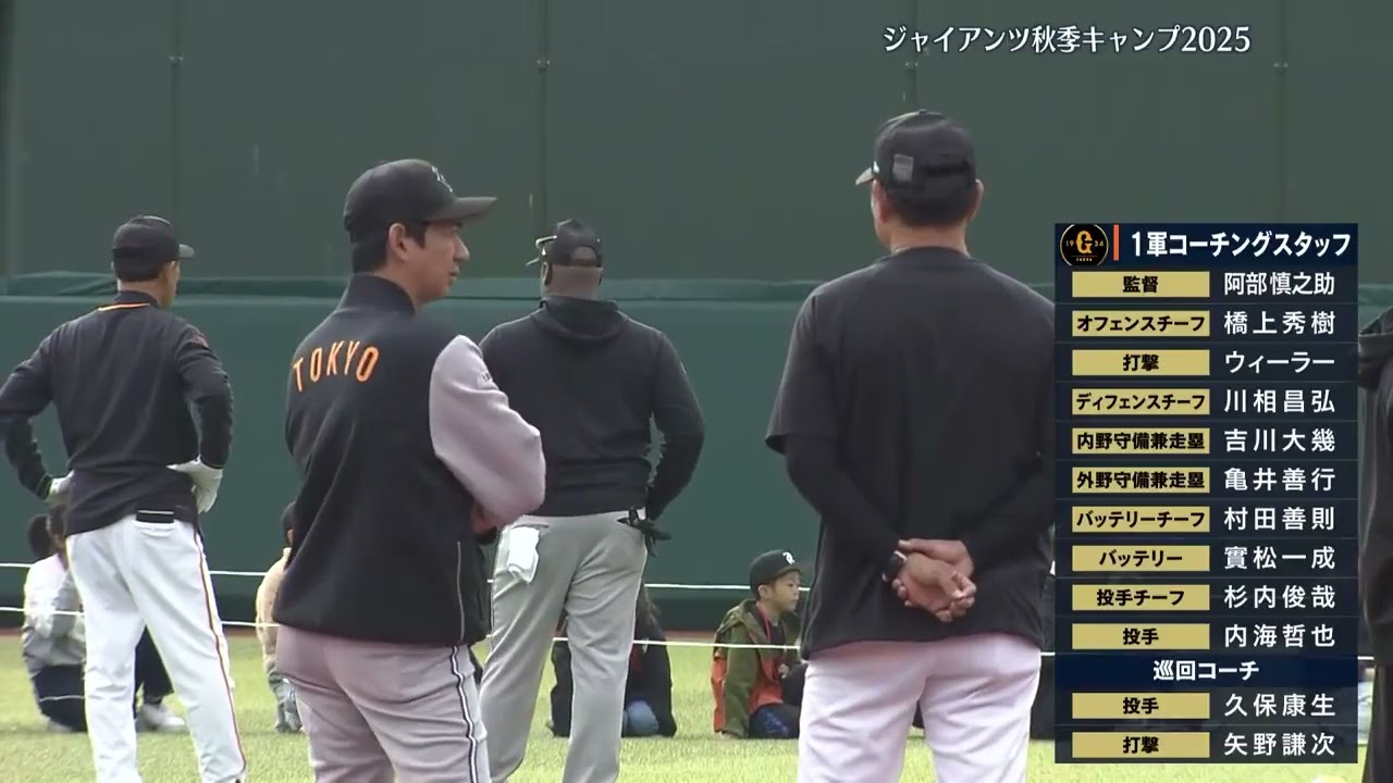 石井卓郎新二軍 監督の姿も見えます。この後ろ姿は安倍監督でしょうか。橋神秀飛の姿もあります。 安倍慎之助監督、そして新しく就任しました石井卓郎新二軍監督。 この石井2軍監督は 2020年から2021 年はこのジャイアンツの一軍の野手総合知を務めていました。 ですから来シーズンからということになりますので、 5 年ぶりのこのジャイアンツの、え、現場復帰ということになります。 画面右側でコーチングスタッフしています。 2 軍監督石井卓郎さん。そしてオフェンスコーチに近城達彦コーチ。 [音楽] 去年まで3 軍コーチを務めていたんですが、近城達彦コーチが 7 年ぶりに2 軍コチに戻ってきます。そして打撃コーチを見ますと、去年現役を引退した大使さん。 今年からジャイアンツのジャイアンツアカデミーのコーチで小学生たちを指導していたんですが、 来年からは離軍の打撃コーチということになります。 その他変わったところで言いますと、 2軍の新バッテリーコーチに 田口正典コーチ日本ハムや大ソフトバンクフォークスでプレイをした田口正典コーチが就任しました。 そして3軍を見てみますと、 監督には中央大学出身ジャイアンツで 4年間プレイをしました相裕監督が就任。 そしてディフェンスコチ内野趣守備県総塁コーチも県ということですが、今年現役を引退しました若林秋明博知が就任しました。 ジャイアンツの拓也とのトレードで、 去年日本ハムファイターズに移籍をしたこの若林秋明秋博浩司ですが、今年現役を引退してジャイアンツに戻ってきました。そして 3 軍の投手コチを見ますと、西村健太郎コーチの名前があります。 ジャイアンツで埼獲得したこの西村太郎コーチですが、ジャイアンツのアンダー 10 号ユスチーム玉摩川ボーイズのコーチを経て来年から 3 軍コーチということになります。そしてバッテリーコーチには市内川智コーチが就任すると かなり大きくこのコーチングスタッフの面々も変わりました。 [拍手] 一軍監督は、あ、出ました。安倍慎之助監督。そしてオフェンス、ディフェンス、バッテリーとそれぞれカテゴリーを分けるような形になりまして、それぞれにチーフコーチがつきます。 オフェンスチーフコーチ、橋神秀。 そしてバッティングの大撃コーチにはウィーラーコーチがつきました。 ディフェンスのチーフコーチは川井正博チ。え、昨年、あ、去年ですね。去年まで 1軍のコーチを務めていて、今年は 2 軍のコーチだったんですが、え、来年から再び 1軍のコーチということになります。 そして内守備県総塁コチですが、吉川大コチが就任するということです。 ジャイアンツでプレー。そして去年までは 3 軍のコーチを務めていました。吉川大コチ 1 軍の内野守備県総塁コーチということです。 [音楽] 巡回コーチには 菅野智友之行、それから田中正弘。ま、 今年は苦しんだ都合小なども、え、 じっくりとその復活 サポートをしている久保チ、そして打撃の 矢野健二コが 巡回という形になります。 今ご覧いただきました1軍、2軍、3軍の コーチングスタッフで来年ジャイアンツは セリーグ王者奪して 日本一へと挑戦することになります。 その他先ほども、え、映像で移りましたが 、このキャンプにおいては現役を引退した 蝶の久吉さん。そして 臨時コーチとしてジャイアンツでもプレイ しました一寸プ氏がこの周期キャンプには 加わっています。 改めてこの久吉しますとプロ生活 16 年新人王を獲得するシーズンから始まりました。そして首打者坂本覇斗と分け合った最打田もありました。ベスト 93回ゴールデングラブも 3度獲得。今年は 17 試合の、え、出場にとまっていました。 シーズンが終了してから現役の引退が発表されました。ま、そしてこちらが臨時コーチ一寸欲チです。ジャイアンツはもちろんジャイアンツを始めロッテやオリックスでも日本球会ではプレイをしました。 [音楽] 非常に強力なコーチが周期キャンプには加わっています。 まさに安倍 監督とも中軸を打っていたという椅プ はい。 [音楽]