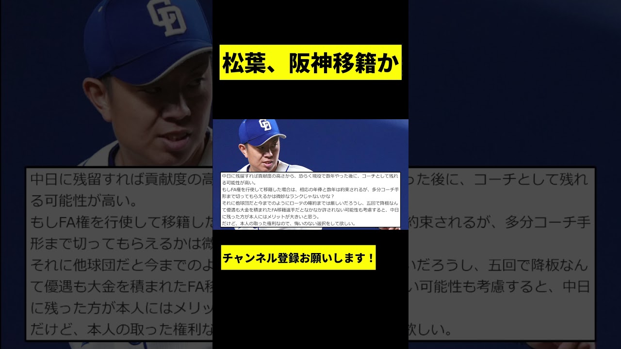 松葉阪神へ。FA健康士なら複数球団の 争奪戦化全盛期迎えた35歳左腕巨州は 保証がいらないのはプラスだが35歳で あと何年やれるか分からない選手にどこ までの年当たり1億以上出す球団が現れる かどうか。前半戦こそ防御率も良く長い イニングも投げていたがその疲れが出た せいか後半戦は明らかに状態が落ちている 。やはり長いイニングは投げさせずに5回 か6回までで下ろしたりリフレッシュマ勝 を挟んだ方がシーズン通して活躍できると 思う。中日に残留すれば貢献度の高さから おそらく現役で数年やった後にコーチとし て残れる可能性が高い。もしFA権を行使 して移籍した場合は総の年方と数年は約束 されるが多分高知手方まで切ってもらえる かは微妙なランクじゃないかな。それに他 球団だと今までのようにロテの格約までは 厳しいだろうし、5回で交番なんて優遇も 大金を積まれたFA遺跡選手だとなかなか 許されない可能性も考慮すると中日に残っ た方が本人にはメリットが大きいと思う。 だけど本人の取った権利なので悔いのない 選択をして欲しい。2人とも残ってくれる に越したことはないが個人の権利なので 仕方がない。この先の成績に似合わない マネーゲームをしてしまうとただでさえ 長期低明しているチームにの編成に師障を きたしてしまうと思う。松葉投手前半は目 を見張るような活躍してくれましたが、 後半に完全に息き切れしてしまいました。 ここまでの通算成績を見ると、おそらく年 の活躍は難しく、年齢的にも改善は難しい と思う。柳投手もこれまで長々期名の チームで相当な登板試合で援護がなく、 勝ち星の点ではかなり損をしているように 思えますが、ここ近年の怪我や成績を見る と成績に見合わない先を期待しての金額を 出すのはどうかなと思えてしまう。松葉は 正直前半戦はかなりの上ぶれで成績がつい てきた。戦は疲れもあったけど、甘い球を 相手チームが前半戦のようには打ち損じて くれなかったからなかなか勝てないで 超尻りが合ってきた感じでも規定投球会は クリアしたしほぼ1年ローテを回せたと いうことはFA健康士に関してはかなりの 高材料あとは多球団が前半戦と後半戦 どちらが本来の松場なのかをどう判断する かでしょうね。でも前回のFA権も行使せ ず残留だったことを考えると今回松場は FA宣言するのかな。かなり微妙な気が するけどね。ご視聴ありがとうございまし た。 [音楽]