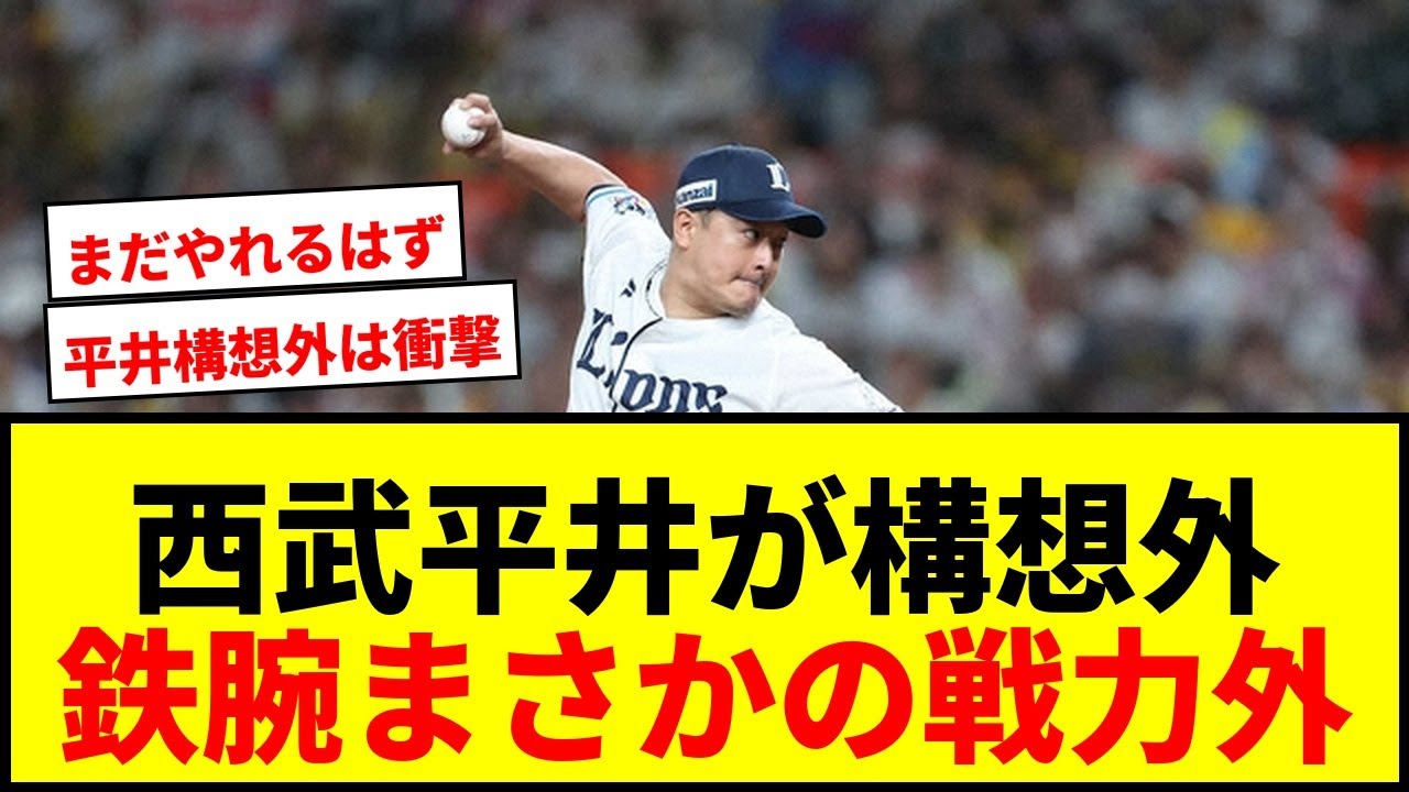 [音楽] 西武の外 1まさかの戦力西武の中平井勝投手 33 ガキの戦密構想から外れていることが判明しました。平投手は 2019年にパリーグ記録を更新する81 試合に登板しグレンに大きく貢献しました。しかし昨期は 13 試合、今期は一軍登板なしと登板機会が激減していました。本人は NPB での現役続攻を強く希望しておりトレーニングを継続しています。 [音楽] まだ30 代前半中継テスナ球団は獲得に動くべきには感謝しかないパくしてなかった。 中継で行けるしか得に動く球団はあると思う。 FA で残留させたのにこの扱い球団の意図が不明。 まだやれそう。ヤクルトなら出番ありそう。 ファでもちょうど浴びてた印象世代交代の波びっくりだがまだ活躍できると思う。セリーグに行ってほしい。 [音楽] 先発展希望とFA 権敵が近くてアピール失敗したか。 平井さん、まだまだやってほしい。どこかから手が上がるといい。ライオンズは投資がついからない。セリーグが獲得してほしい。実績 [音楽] 10分で1 年間を休めた鉄交渉下手だったのかな? FAで残ってくのじゃ西武でFA 取った選手は球団へ行く。 者への冷鉄的な現実 [音楽]