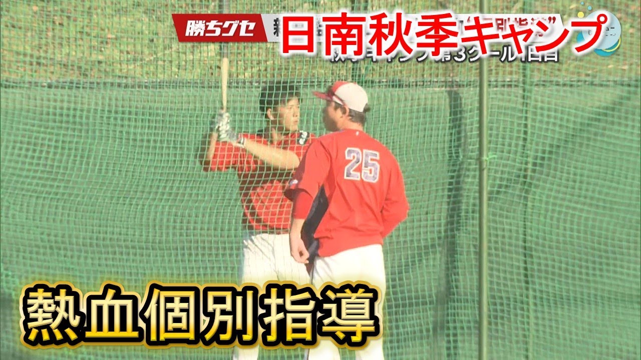 宮崎県日南市で行われている秋のキャンプ は昨日から第3クールに入りました。 首脳人から若定熱のこもった個別指導で レベルアップを促しています。 愛肉の雨の中迎えた第3クールの初日。 全体練習の前にブルペンに姿を見せたのは キャッチャーに再挑戦している二又一選手 と 石原之高知でした。 練習ではボールを取る面が大な特殊なミットを使用。 ボールを掴むのではなく体に引きつけて補給し、素早く右手に持ち替えて早急に移る動作を繰り返すなど、およそ 1 時間近いマンツマン指導が行われました。 も4年ぶり になるんで、ま、本当こうまた1から しっかりキャッチャーの動きをできるよう にと思って、ま、フェニックスと、ま、 このキャンプをやるので、ま、早出から こう手伝もらったりしてるので、本当 ありがたいなという風に思ってます。 一方、新井監督からじ々に指導を受けたのは今シーズン 1軍で出場機会のなかった 2年目の中田優ト選手でした。 全体練習中には新井監督が見り手ぶりを交えながら行く時に腕が早く前に出てしまうという中田選手の悪い癖を指摘し過半身でスイングするようにアドバイス。 中田選手は早速力強い打球を飛ばして指導に答えていました。 個別指導は午後の個人練習の時間にも 1日中新井監督の視線を 1人占めした中田選手は 今シーズン 1 回も一軍に上がれなかったんで、ま、アピールの場も少ないですし、こういうキャンプでしっかりアピールしたいなって思ってたんで、ま、教えてもらえてるこ ことはすごくありがたいですし、大事にし ていきたいなと思ってます。ま、 バッティング練習とかでは自分のものに なってきてはいると思うんで、ま、そこを どうにか実践形式の場で出せたらいいなっ て思ってやってます。 [音楽]