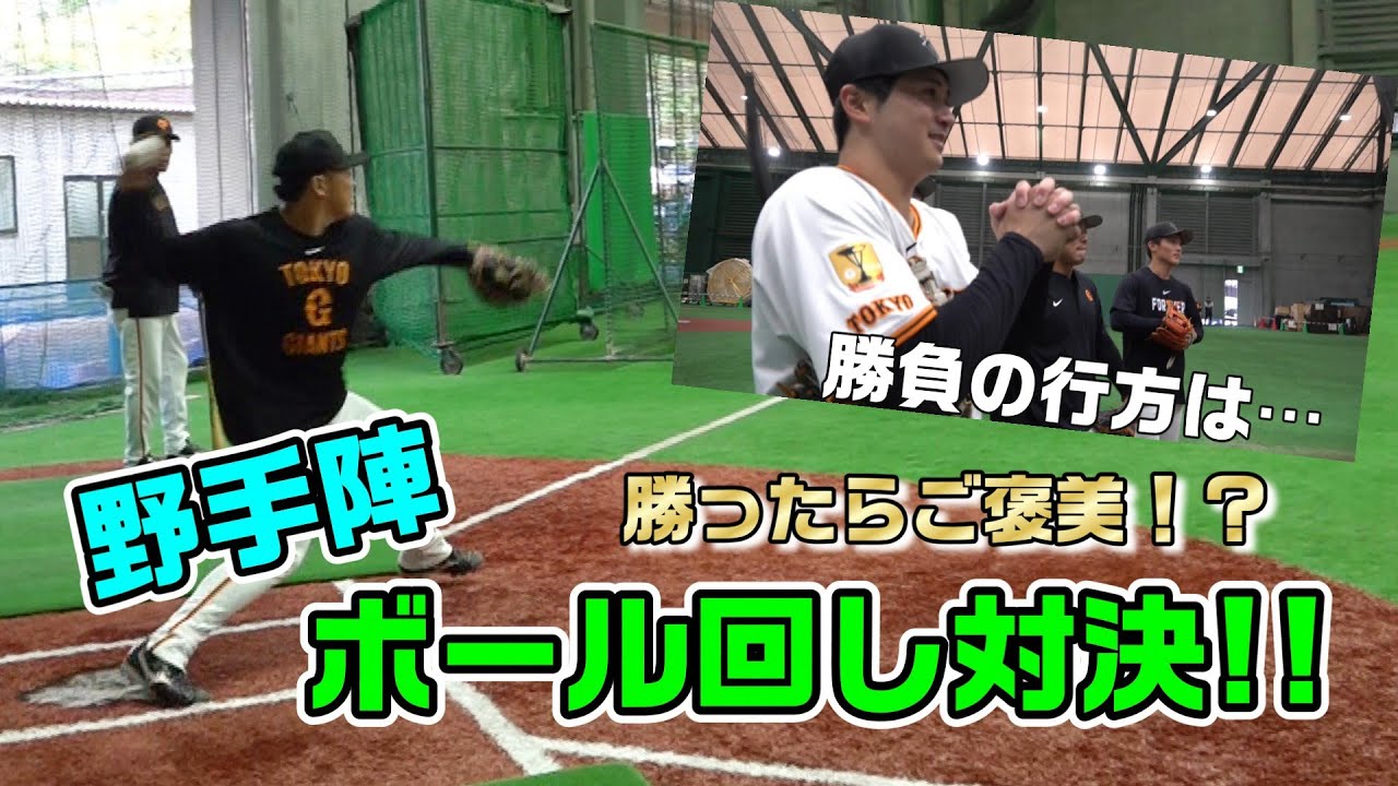 野手陣が2チームに分かれて、ボール回しのタイムを競い合う!