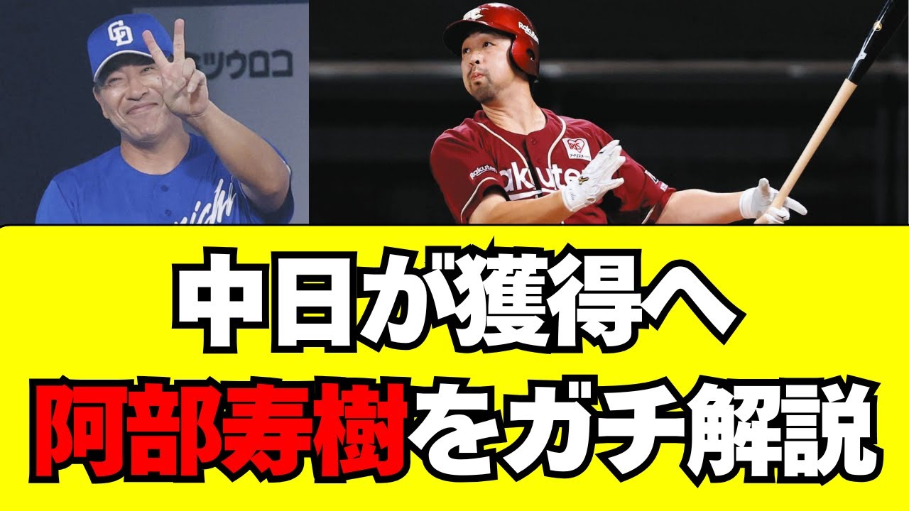[音楽] 中日ドラゴンズが楽天を戦力会となった 安倍選手の最という報道が出ました。 詳しく解説していきます。 11月の13日サンスポさんからのみなん ですけれども、こうした報道が出ました。 中日が楽天を戦力外になった安倍都市内野 種35歳の獲得調査を進めていることが 12日分かったと報道が出ています。ま、 この安倍選手は185cm85km、12 月で36歳になる。ま、つまり2026年 に37歳を迎える右のヤ種です。 岩手の一之関第1位出身の選手でそこから 明治大学に進んで、大学では1年の春から ベンチ入ってサードショートとして通算 打率は2割6部3人ホームランがなし。 そっからホondダに入社しまして、 社会人に入ってからセカンドとして4年間 プレイしてようやくドラフト5位で指名を 受けたという苦労人の選手です。指名の際 には落ち合いGMの後押し手もあったと、 ま、安倍がいいんじゃないかと声もあった というような報道も出ています。そして そっから中日で7年プレイをした後に楽天 の枠井投資とのトレードで楽天に移籍と なりました。ま、この時のトレードは、ま 、結構こう中日ファンからもなんでこう ベテランのピッチャーを取ってこう野種 なかなかこう打てない中で打てる選手を 出してしまうんだと批判的な声っていうの は結構多かったです。ま、そんな中楽天で 3年プレイして2025年のオフに楽天 から戦力回通告を受けています。ま、 そんな安倍選手のプロイリゴの成績 振り返っていきましょう。 まず中日で主に活躍した3年間のシーズン 。19年が129試合、2割一輪、ホーム ランが7本、打点が59、OPSが742 。そして2020年が115試合、2割5 7人、ホームランが13本。この13本が キャリアハイですね。そして打点61、 OPSが715。2022年は133試合 、2割7部、ホームランが9本、打点が 57、OPSが735。この年を最後に 楽天に移籍しています。楽天では2023 年が78試合、2割5輪、ホームランが4 本、OPSが738。2024年が78 試合、2割2部7輪、ホームランが9本、 OPSが711。2025年は43試合で 2割1部が3本、OPSが723です。ま 、この成績見ていただくと分かる通り、ま 、OPSが大体7000前半から中盤 ぐらいで収束していると感じで、楽天に 入ってからは打率こそ、ま、特に2024 年、2025年と落ちているんですが、 OPSペースで見るとそこまでこう落ちて いないというところですね。ま、OPS 7005ぐらいの成績は期待できるという ような成績になっています。ま、そんな 安倍選手の現在のポジションであったり、 実力はどれくらいなのか、ここも掘り下げ て見ていきたいと思います。 中日ではセカンドでレギュラーを獲得して 、ま、セカンドでの出場っていうのも 多かったですし、守備症も悪くありません でした。ま、ただ立波監督の移行もあって 、中日終盤はサードへ転校ということに なりました。そして楽天ではセカンドを 守ることなくファーストセカンド、そして レフトがメインポジションとなりました。 楽天1年目の2軍の時にちょっとセカンド 守ったぐらいで、それ以外はセカンドでの 出場っていうのはありません。そして、ま 、2軍を中心にライトを守るケースって いうのも、ま、少し見られました。ま、 特にこう2軍でですね、2025年も、ま 、少しこうライトでの必場っていうのが ありました。そして2025年は1軍では ですね、6月以降出場がなく2軍ぐらい しかずっと続くようなシーズンになってい ます。そして2026年は12月に37歳 を迎えるというシーズンになりまして、ま 、成績的に見てもちょっと衰えは見られて いるというのは間違いありません。25年 2軍では43試合打率が2割6部リホーム ランがなし打点がここの出塁率3割1部林 OPSが625という成績です。元々1軍 では打率こそそこまで高くないんですが 長打が出るのでOPSは700を軽く 超えるというのがま、例年の数字だったん ですが2軍でも2025年はなかなか長打 出ずホームランも出ずOPSが625と定 な成績に終わっています。なので過去に 中日に似た時のようにセカンドを守ると いう選手ではなく、ま、どちらかというと こう打撃が求められるようなファースト サードレフトこの辺たりのポジションを 守る選手なんですが、ま、それでも なかなかですね、2軍でも成績上げること ができずに1軍に最昇格できず、結局6月 からですね、1軍で出場できないという ようなシーズンになってしまいました。 そんな安倍選手が仮にこのまま中日に加入 するということになった場合、気用法は どうなっていくのか、こちらを見ていき たいと思います。 の中日を見ていくと中田選手が引退して ファーストメインの選手っていうのは、ま 、基本的にはボスラー選手のみということ になります。ま、カリステ選手もいますが 、やっぱりこうスタメン候補っていうこと になるとボスラー選手がメインになります 。なので、ま、ファーストサードどちらも 守る可能性がある選手ということを考える と福永選手とかあとは石川高い選手、 もしくはチェイビス選手もファースト入る 可能性ありますし、ま、こうした選手