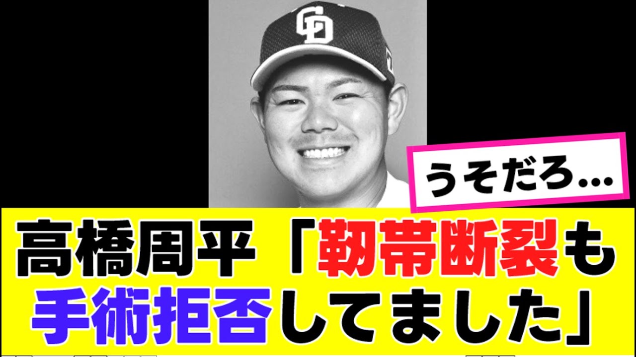 [音楽] 高橋平暴露する。 週日の高橋平な癒しが 9 日契約を公開し衝撃のカミングアウトをしたことが話題となっている。契約は今期からの [音楽] 2年契約で年は現状維持の 6000万円。今期6月11 日の楽天戦で守備中に総者と交差しワンを負傷。野球人生で [音楽] 1番の大画だったと明かす。 これまで詳細は公表されていなかったが、 この井位に脱球もして左肘の内側と外側の 人体が断裂していたと告白医師からは手術 をしないと絶対に治らないつけられたと いう。それでも高橋は保存療法を選択し8 月くらいには復帰するつもりだったと 振り返る。9月には2分線に出場したもの の1軍復帰はならずシーズンを終えた。 復帰はしたけどトレーニングができてい なかった。 とを振り返る左肘についてはおじいちゃんになって筋肉がなくなったらまたグラグラする状態しつつ筋力強化でカバーしていくかえ、これに対し次のような声が上がっている。 [音楽] 2 年契約で来期までの契約は保証されているのに手術しない判断は悪いけど理解できない。 手術して元のパフォーマンスができる保証もないし本人を尊重するべき。 断熱でも保存とかあるの荒らくっつくんだろうか? 保存って治療を先延ばしにしてるだけだからな。 色々理解しが第2 年契約した球団はやっちまったって感じかな。 前に小指の人体を断した時も保存を選んでそれ以来調打力が落ちたような気がする。事実が嫌いなのかな? [音楽] よかったら高評価お願いします。 [音楽]