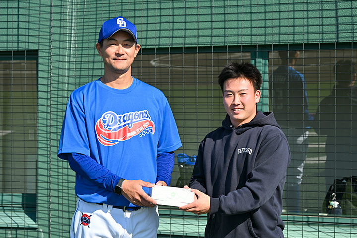 試合前に2019年メンバーの小鎗稜也選手が激励に訪れました。