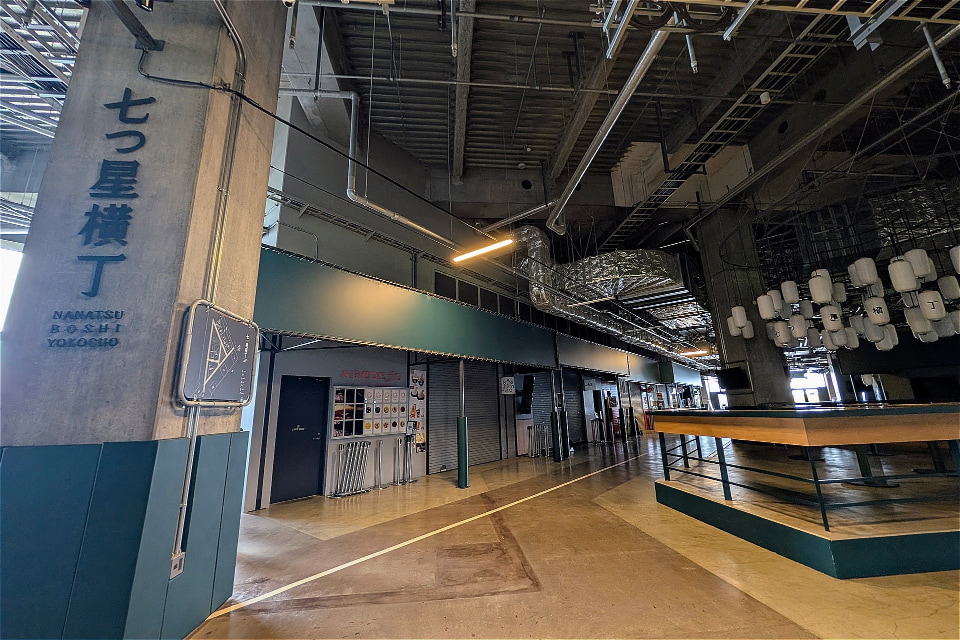 外野席の一部がない代わりにブルペンが観客席から直接見える構造を採用。はたまた、試合後も飲食できる店が連なる「七つ星横丁」が2階席の後ろに用意されている。