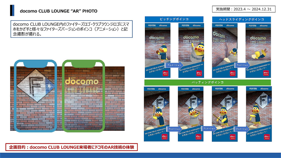 たとえば、「ドコモクラブラウンジ」にあるファイターズのロゴを、スマートフォンのカメラで認識するとファイターズのユニフォームを身に着けたポインコが画面上に登場。ファイターズロゴをバックに記念撮影できるといった体験を提供した。