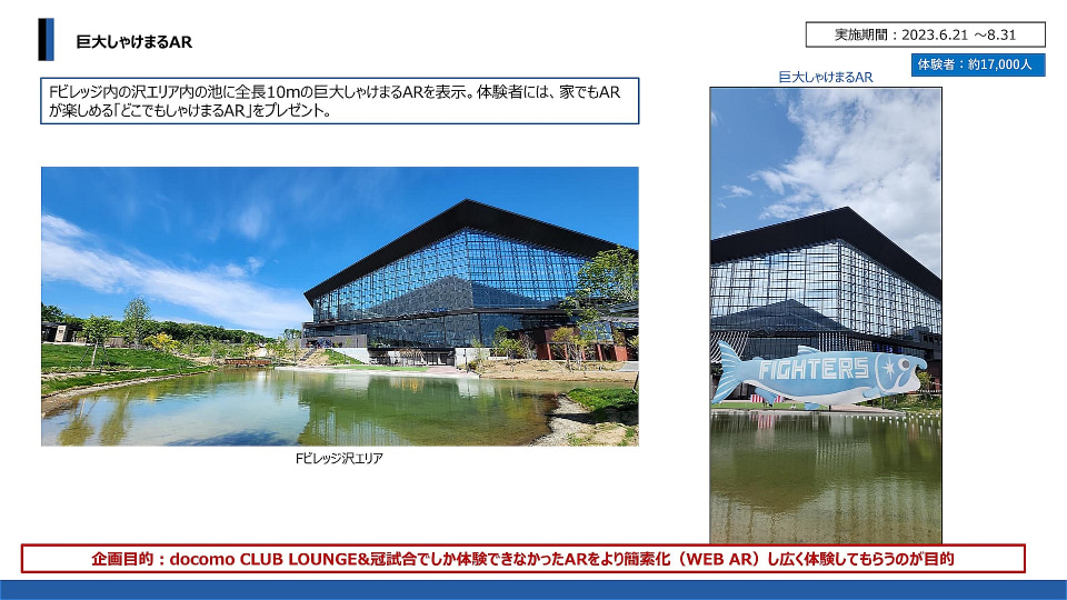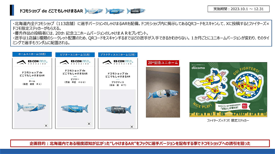 2023年に実施されたしゃけまるを用いたARコンテンツは、6月~8月にエスコンフィールドの池、7月~10月に公式Xアカウント、11月にキャンプ中のエスコンフィールド、そして10月~12月にドコモショップでの取り組みと、変遷していったことになる。