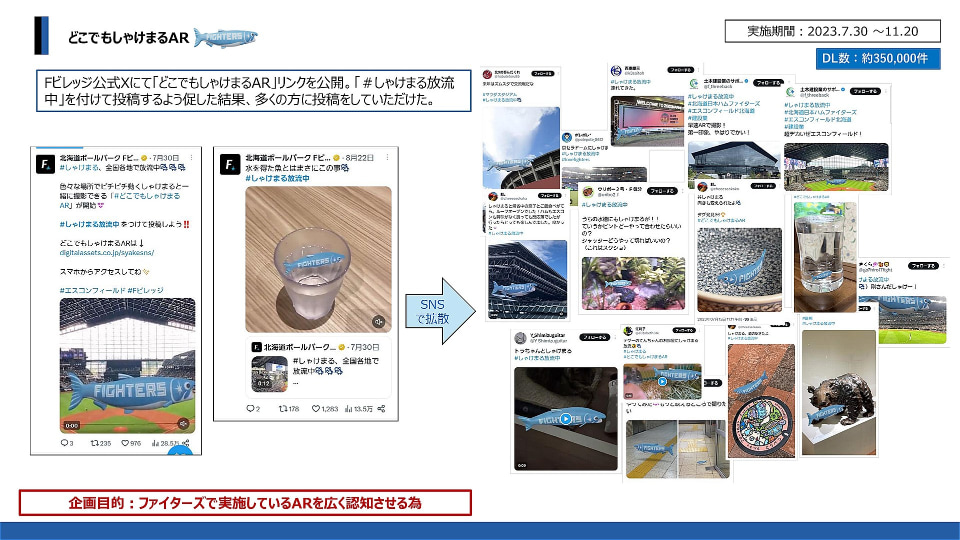2023年7月末~11月20日には、ファイターズの公式X(旧Twitter)でも公開された「どこでもしゃけまるAR」は、約35万ダウンロードを記録。ファイターズがARコンテンツに取り組んでいることをより多くのファンへ伝えた。