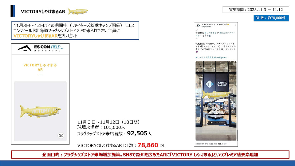 このほか、ファイターズが勝利した試合に限り、エスコンフィールド内のショップで販売される「VICTORYしゃけまる(ビクトリーしゃけまる)」のARも制作し、2023年11月というキャンプ期間中、グッズストア経由で配布した。グッズストアに来店した約9万2000人のうち、7万8000人強が「VICTORYしゃけまるAR」をダウンロードした。