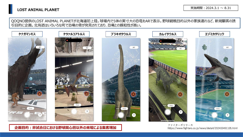 そのひとつとして、2024年3月~8月に、NTTコノキュー提供のARコンテンツ「LOST ANIMAL PLANET」をエスコンフィールド北海道で体験できるようにした。マンモスや恐竜がARコンテンツで登場するというもので、半年の期間中、初めてエスコンフィールドに来場した人が約2000人弱にのぼった。