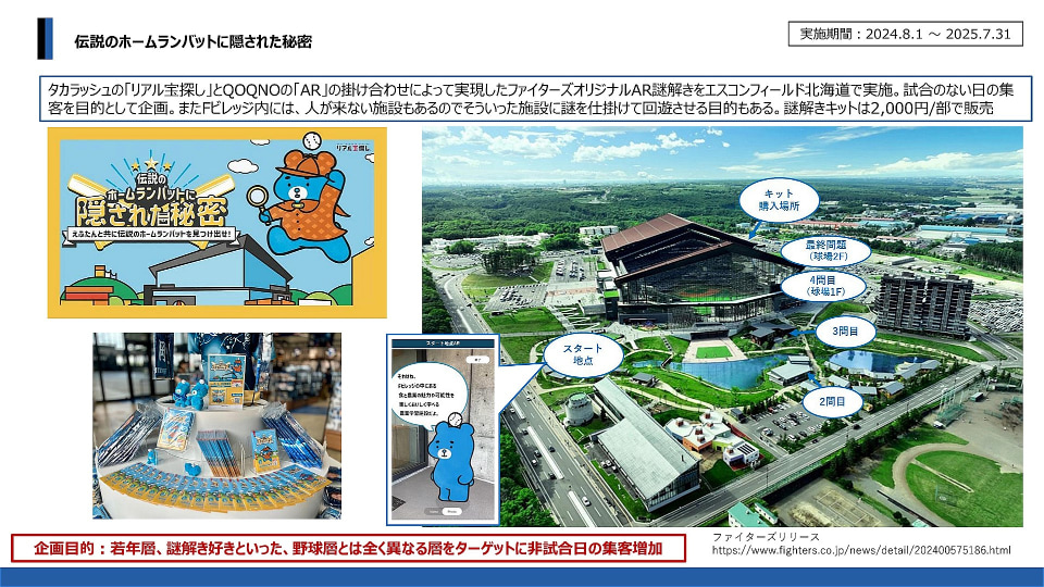 また、リアルでの宝探しや謎解きを提供するタカラッシュとコラボレーションした「伝説のホームランバットに隠された秘密」が2024年8月~2025年7月に実施された。謎解き愛好家など、野球ファンとは異なる層に向けて、エスコンフィールド北海道へ訪れるきっかけとなるもの。球場内のレストランやカフェなどのほか、普段は集客が難しいエリアへの回遊を促すようになっていた。