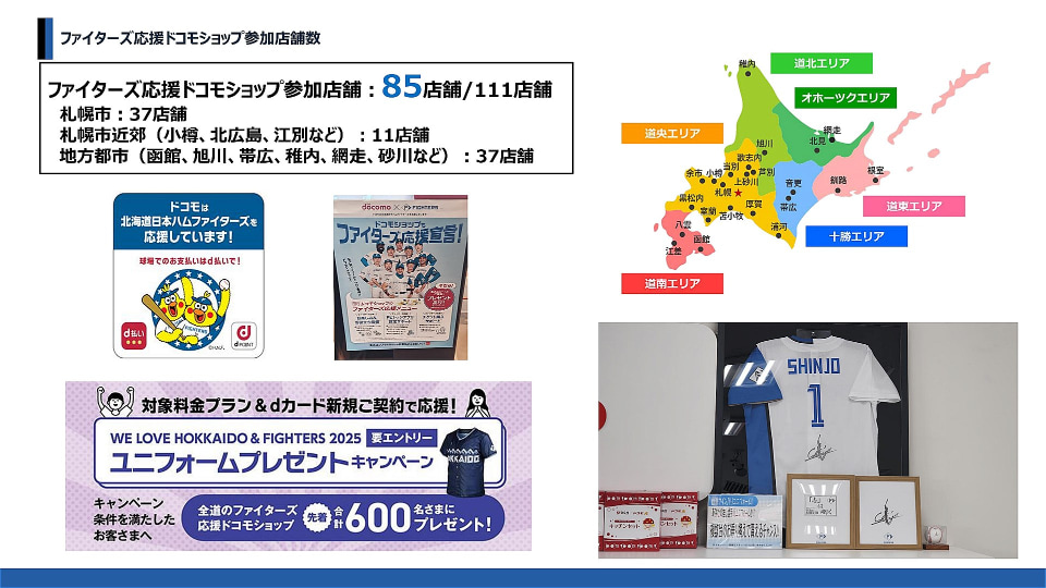 応援ショップでは、エスコンフィールドのグルメ情報発信、チケット購入サポート、dアカウントの新規作成支援、スタジアムWi-Fiの設定案内などが含まれる。北海道内111店舗中、85店舗が「応援ショップ」に立候補し参加しているという。