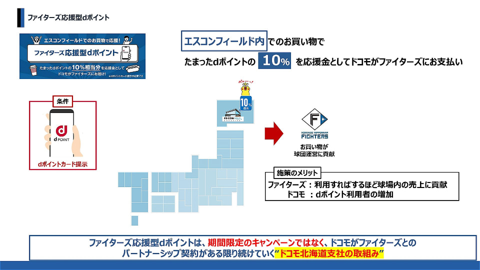 特に注目されるのが、「ファイターズ応援型dポイント」という日本で初めての取り組み。エスコンフィールド内での買い物で貯まったdポイントの10%を、ドコモが「応援金」としてファイターズに支払う仕組みだ。期間限定キャンペーンではなく、パートナーシップ契約が続く限り継続するドコモ単独の取り組みになるという。