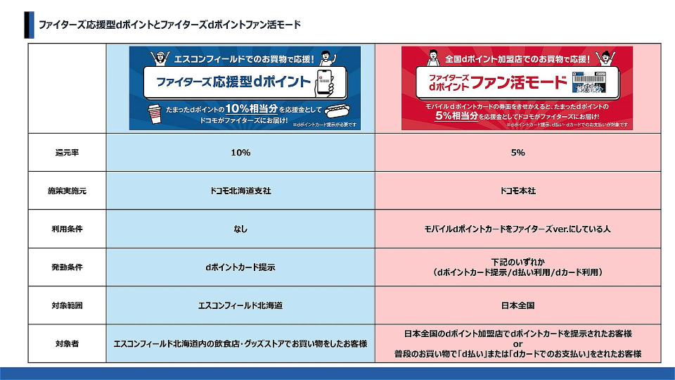 さらに、モバイルdポイントカードのデジタル券面をファイターズデザインへ変更するだけで、貯まったポイントの5%がファイターズに支払われる「ファイターズdポイントファン活モード」も始まった。
